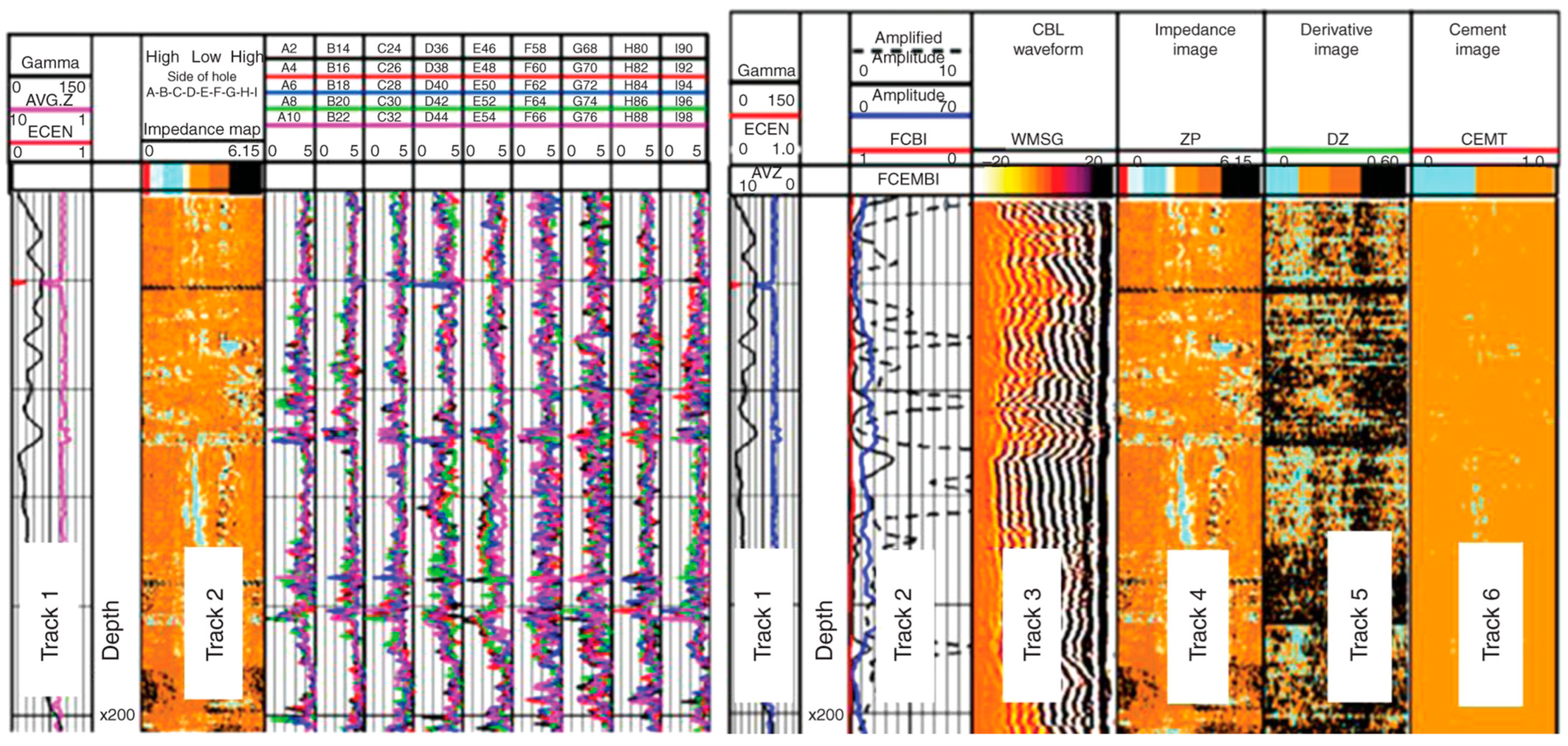 - Graham, W.L.; Silva, C.I.; Leimkuhler, J.M.; De Kock, A.J. Cement Evaluation and Casing Inspection with Advanced Ultrasonic Scanning Methods. In Proceedings of the SPE Annual Technical Conference and Exhibition, San Antonio, TX, USA, 5–8 October 1997; p. SPE-38651-MS. [Google Scholar]