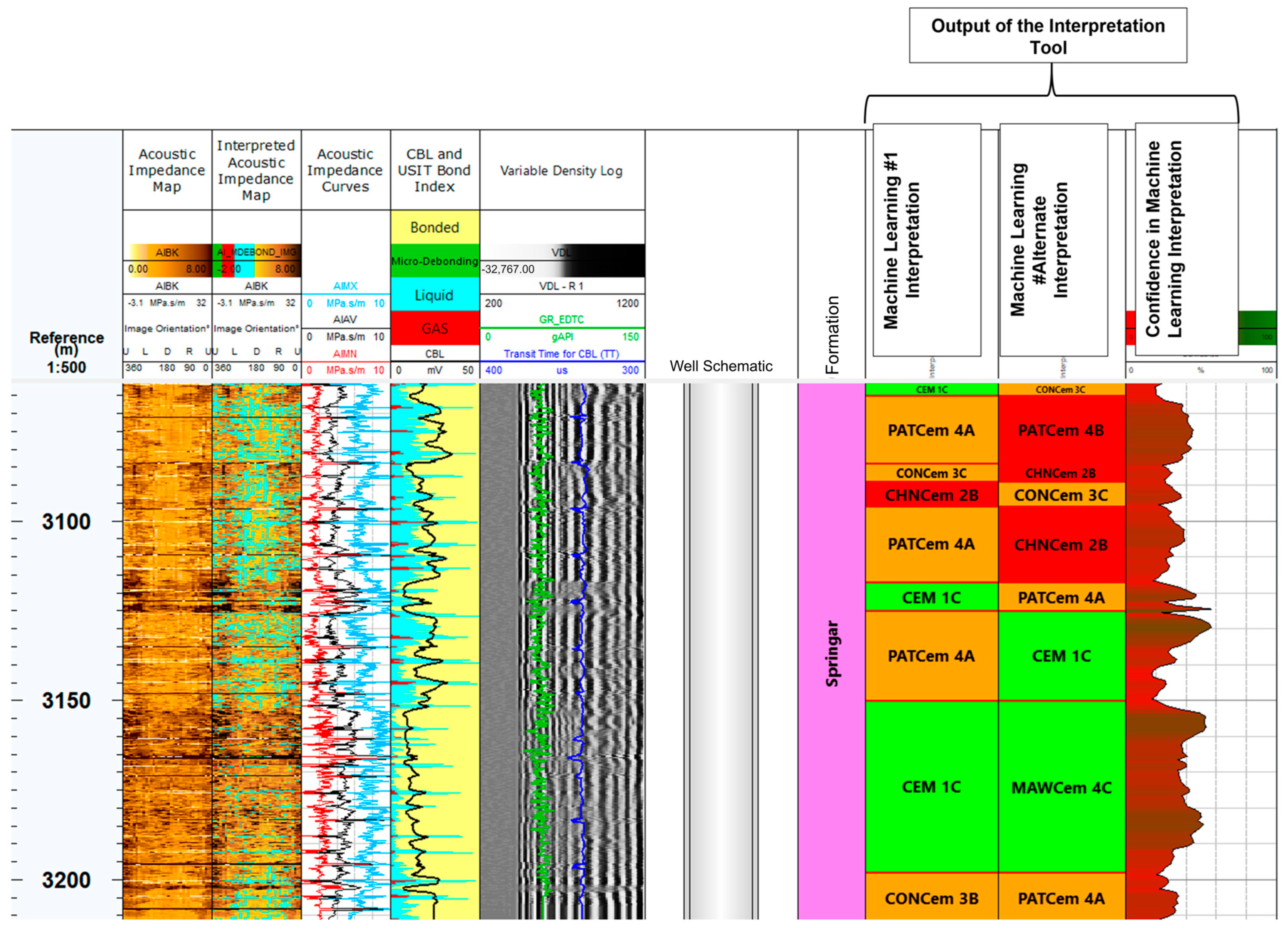 - Transit Time: This parameter reflects the acoustic impedance of the encountered materials, with variations indicating changes in material properties, such as bonding strength. In CCUS wells, lower acoustic impedance can accompany debonding or channelling created by thermal/pressure cycling.