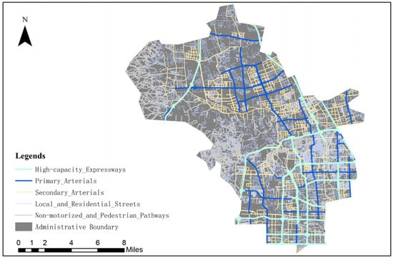 This study selects Haidian District of Beijing as a typical high-density urban area for the research (see Figure 2), conducting optimization analysis for the location of underground smart parking facilities. The “Beijing Land and Space Ecological Restoration Special Plan (2021–2035)” [] explicitly states the priority to advance ecological space restoration and spatial optimization in the central urban area, with a focus on the rational configuration of parking facilities and urban transportation infrastructure. Additionally, according to data from the “2023 China Parking Industry Development White Paper” [], there is a significant imbalance in the distribution of parking resources in Beijing in both time and space, particularly around medical institutions and old residential communities. Statistics show that in the old residential communities of Haidian District, the off-street parking ratio even reaches as high as 26% []. This issue is particularly prominent in high-density residential areas, highlighting the urgency and practical significance of conducting optimization research for the location of smart underground parking facilities.