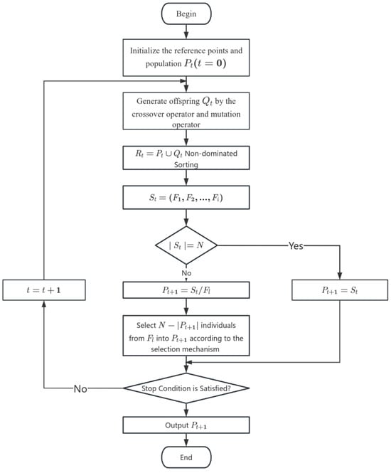 In the multi-objective optimization phase, this study uses the third-generation Non-dominated Sorting Genetic Algorithm (NSGA-III) as the solving tool. NSGA-III is specifically designed to address multi-objective optimization problems with higher-dimensional objectives (usually ≥3 objectives). The algorithm introduces a set of reference points, guiding the solution set to areas of uniform distribution in the multi-objective space, thus overcoming the issues of insufficient convergence or uneven distribution commonly found in traditional multi-objective algorithms in high-dimensional objective spaces []. The core steps of the NSGA-III algorithm include non-dominated sorting, crowding distance estimation, and population updating guided by reference points. The algorithm flowchart is shown in Figure 6. The design of reference points involves pre-setting a series of points in the objective space, significantly improving multi-objective search efficiency and the quality of solution distribution.