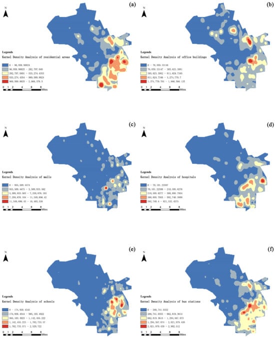 The results of the kernel density analysis conducted on the ArcGIS platform are shown in Figure 7, reflecting the spatial clustering characteristics of different functional areas within Haidian District, Beijing, and highlighting evident spatial distribution disparities. Figure 7a shows that residential areas are primarily concentrated in the southeast, with densities significantly higher than in other regions, indicating a high degree of population aggregation and strong potential parking demand in this zone. In Figure 7b, office areas exhibit the highest kernel density in the eastern part of the district, identifying it as a core business function area where frequent commuting generates substantial daytime parking pressure. Figure 7c, illustrating the density distribution of commercial centers, indicates a concentration in the southeast, largely overlapping with the residential areas. This suggests a clustering of commercial service facilities, where pronounced fluctuations in pedestrian and vehicular traffic are likely during evenings and weekends. Figure 7d shows that hospitals are also densely clustered in the southeast, forming a multifunctional agglomeration belt with residential and commercial areas, thereby imposing heightened requirements for short-term, high-frequency parking demand. Figure 7e reveals that schools are densely distributed in the eastern region, which may reflect educational resource allocation policies, and underscores the need to address traffic pressures during peak school commuting hours. Figure 7f demonstrates that bus stops are also most concentrated in the southeast, not only highlighting the strong accessibility of public transportation in this area but also reinforcing the identification of this zone as a typical hotspot of overlapping population and functional densities.