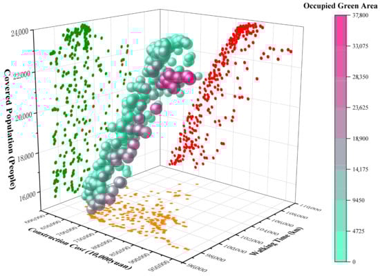 However, most MODM approaches currently only focus on obtaining the Pareto solution set, without delving into the quantitative differences between the solutions within the set. To address this gap, marginal benefit theory has been introduced in recent years as an important supplement. By quantifying the marginal response of other objectives to unit changes in key objectives, it is possible to identify sensitive intervals and potential optimal compromise points within the solution set []. In the context of green infrastructure and stormwater management planning, Seyedashraf et al. (2021) also used multi-objective optimization to analyze the diminishing marginal benefits of capital investment and ecological services, providing theoretical support for investment decision-making []. Similarly, Tang et al. (2021) introduced cost–benefit analysis in the optimization of the Shenzhen LID system, enabling a quantifiable trade-off between investment and service outcomes []. Dong et al. [] proposed a spatial-explicit multi-objective optimization tool for green infrastructure planning, while Carrese et al. [] designed a government parking space leasing optimization model, and Zhao et al. [] achieved real-time parking space matching through a linear distribution method in parking planning. These studies provide multi-dimensional references for optimizing parking facilities in high-density urban areas.
