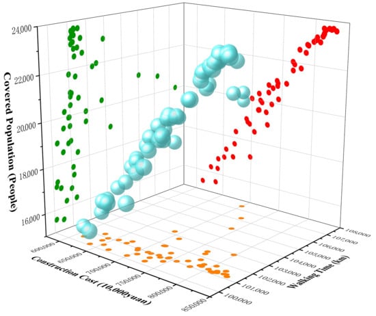 The multi-objective optimization model established in this study covers four optimization objectives: maximizing the population coverage, minimizing walking distance, minimizing construction costs, and minimizing green space occupation. Using the NSGA-III algorithm, a set of Pareto non-dominated solutions with good distribution characteristics is obtained, where each solution represents a different parking facility location option. To further identify the most practically valuable solutions, a green-ecology-oriented selection strategy is employed in the post-Pareto analysis phase. This involves first extracting several solutions with the lowest green space occupation from the complete non-dominated solution set as initial candidate options. Then, marginal benefit theory is introduced to quantitatively assess the trade-off between construction investment costs and coverage efficiency. Marginal benefit theory, originating from economics, is based on the core idea of comparing the ratio of additional costs to the corresponding increase in benefits, identifying the critical point with the highest input-output efficiency [], and thus determining the optimal resource utilization solution. The formula for marginal benefit is as follows []: