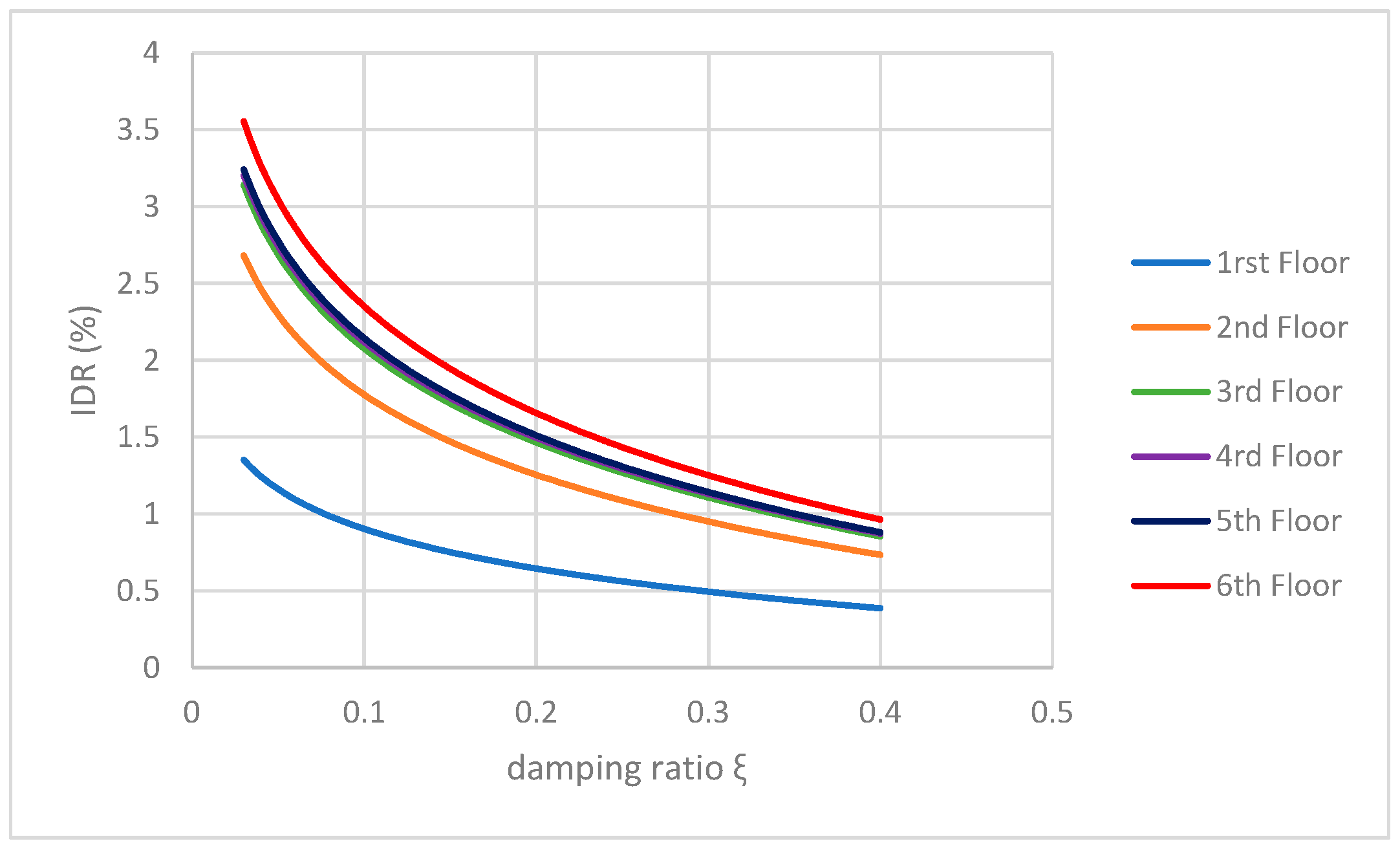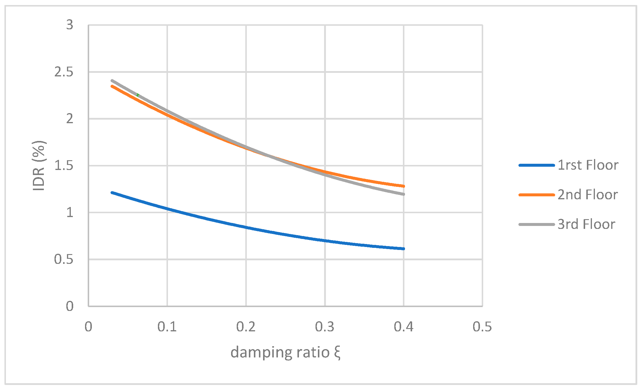 | Damping ratio (ξ)/IDR (%) | IDR = −0.3723ln(ξ) + 0.0461 | IDR = −0.7516ln(ξ) + 0.0461 | IDR = −0.8823ln(ξ) + 0.0462 | |