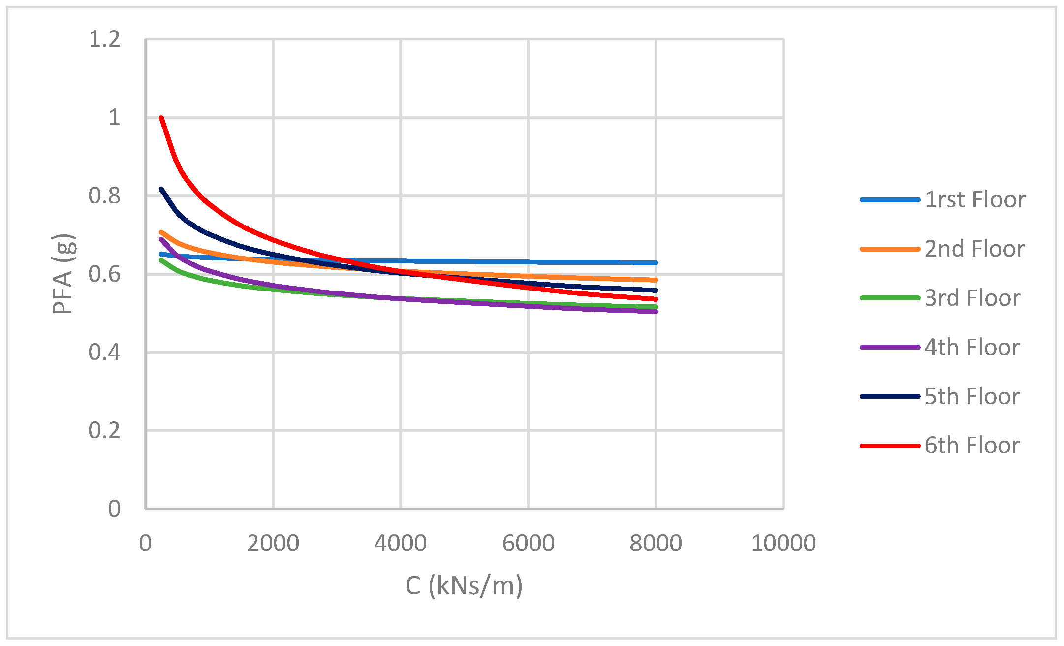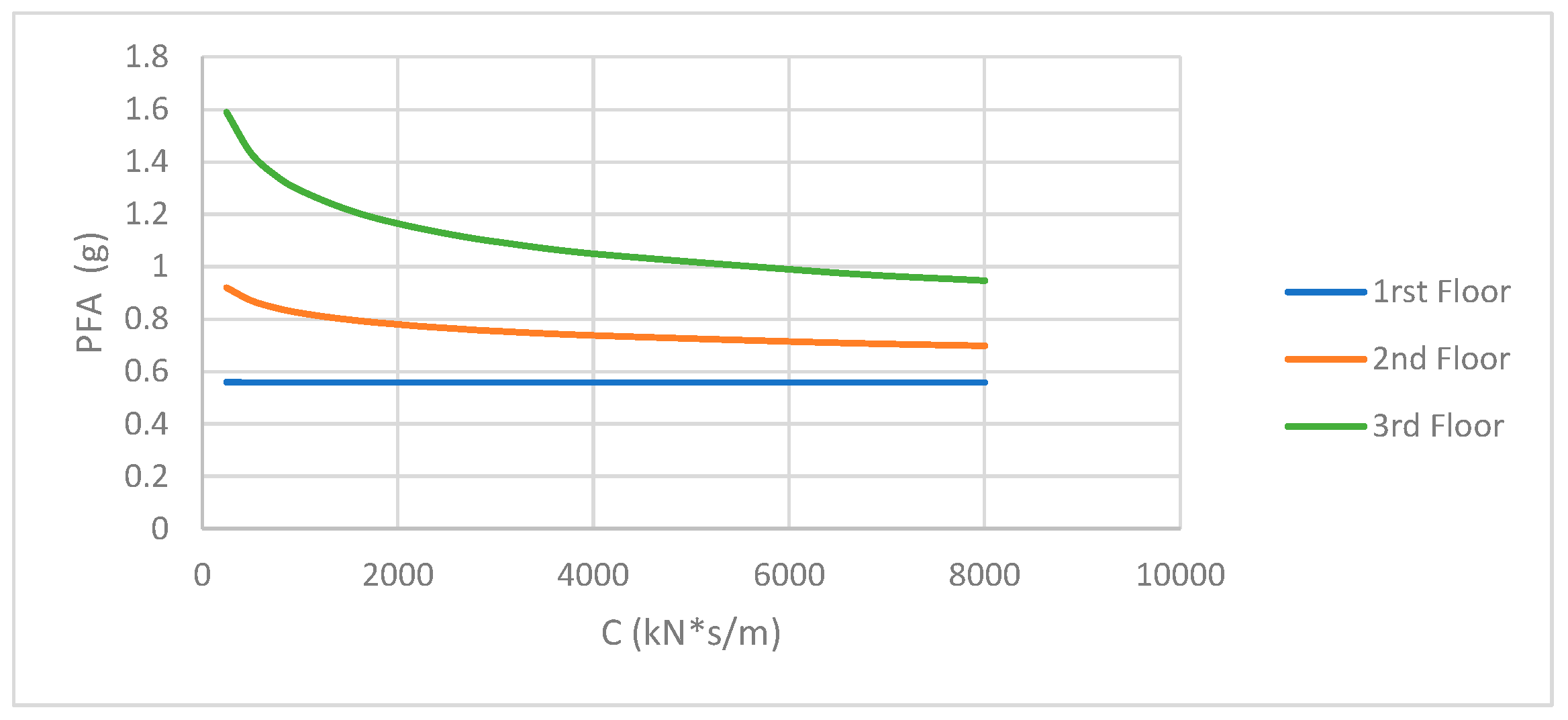 | Dampers’ coefficient c—PFA | PFA = 1.1327c−0.0992 | PFA = 1.5456c−0.1108 | PFA = 2.70705c−0.1840 | |