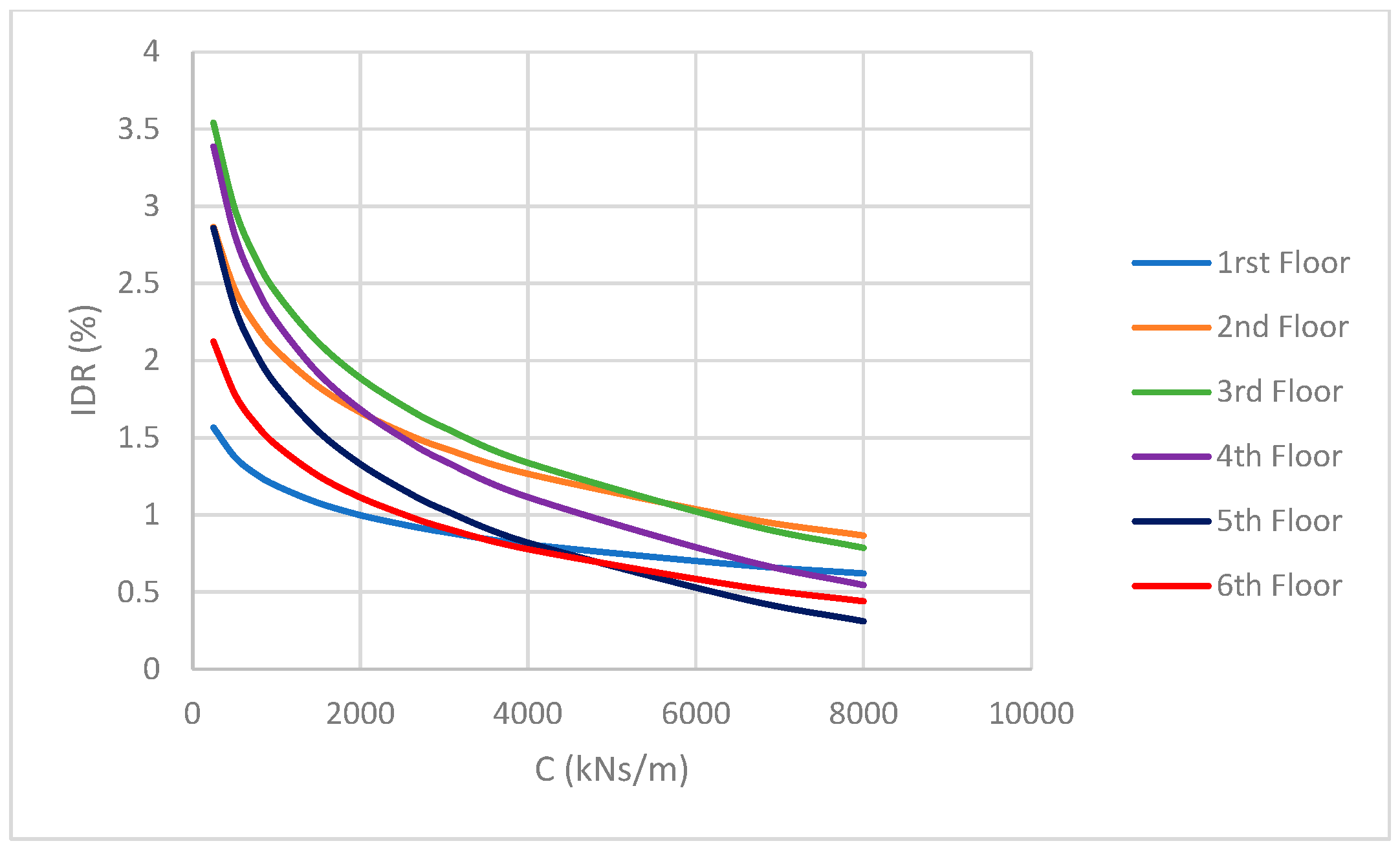 | Dampers’ coefficient c—IDR (%) | IDR = −0.8203ln(c) + 7.9177 | IDR = −0.7358ln(c) + 6.9222 | IDR = −0.4857ln(c) + 4.8054 | |