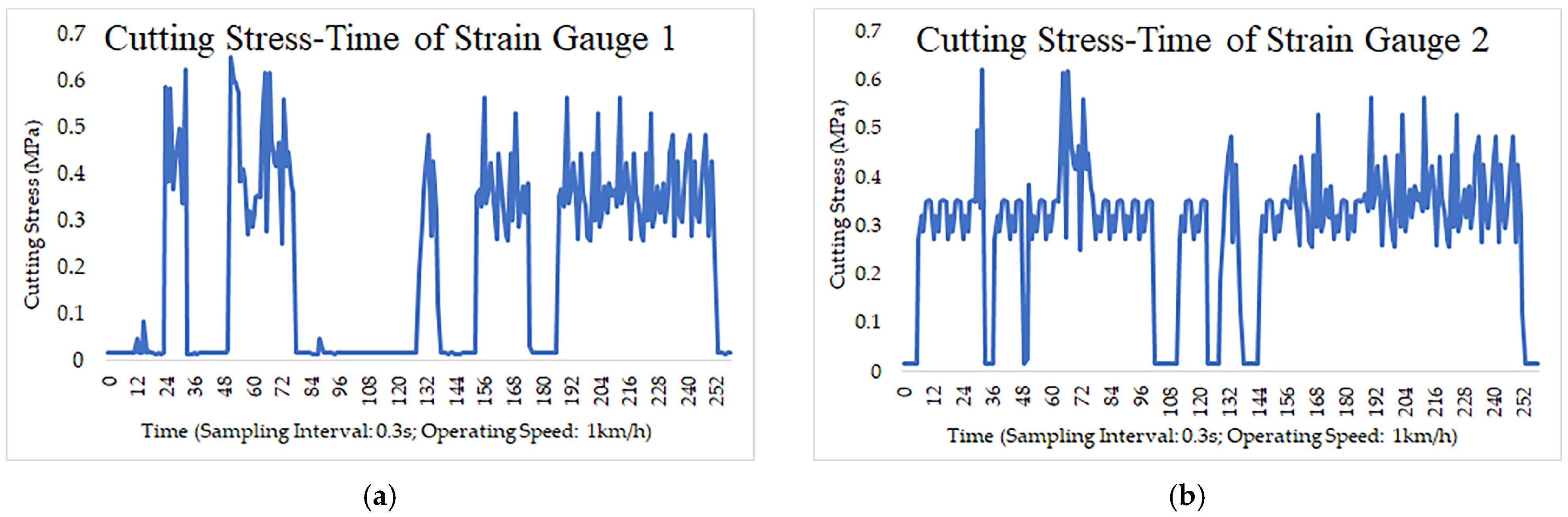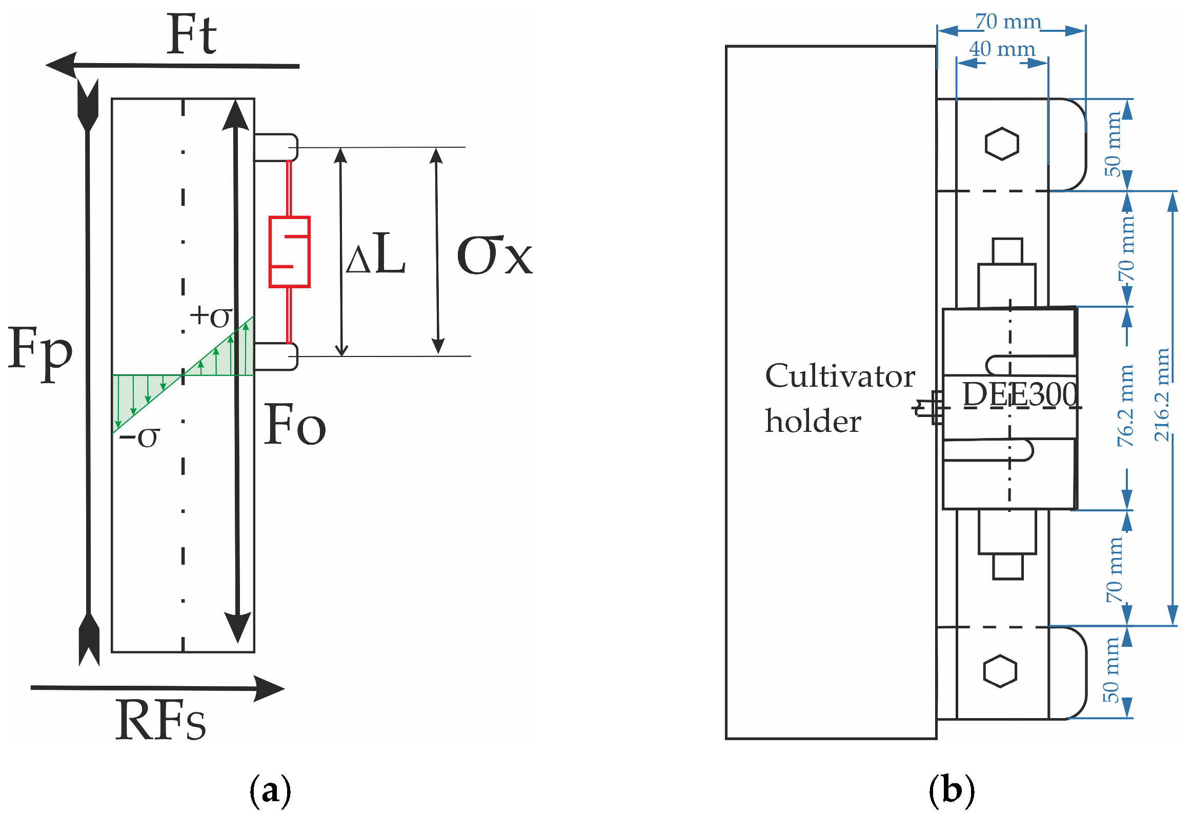 A sufficiently accurate result can be obtained from only one of the two forces, provided that the deformation of the cultivator shank remains within the elastic range. From a practical standpoint, the strain gauge should be mounted on a less vulnerable surface, i.e., the side less likely to come into direct contact with the soil. For this reason, the rear side of the shank was selected, and the compressive force FO was measured.