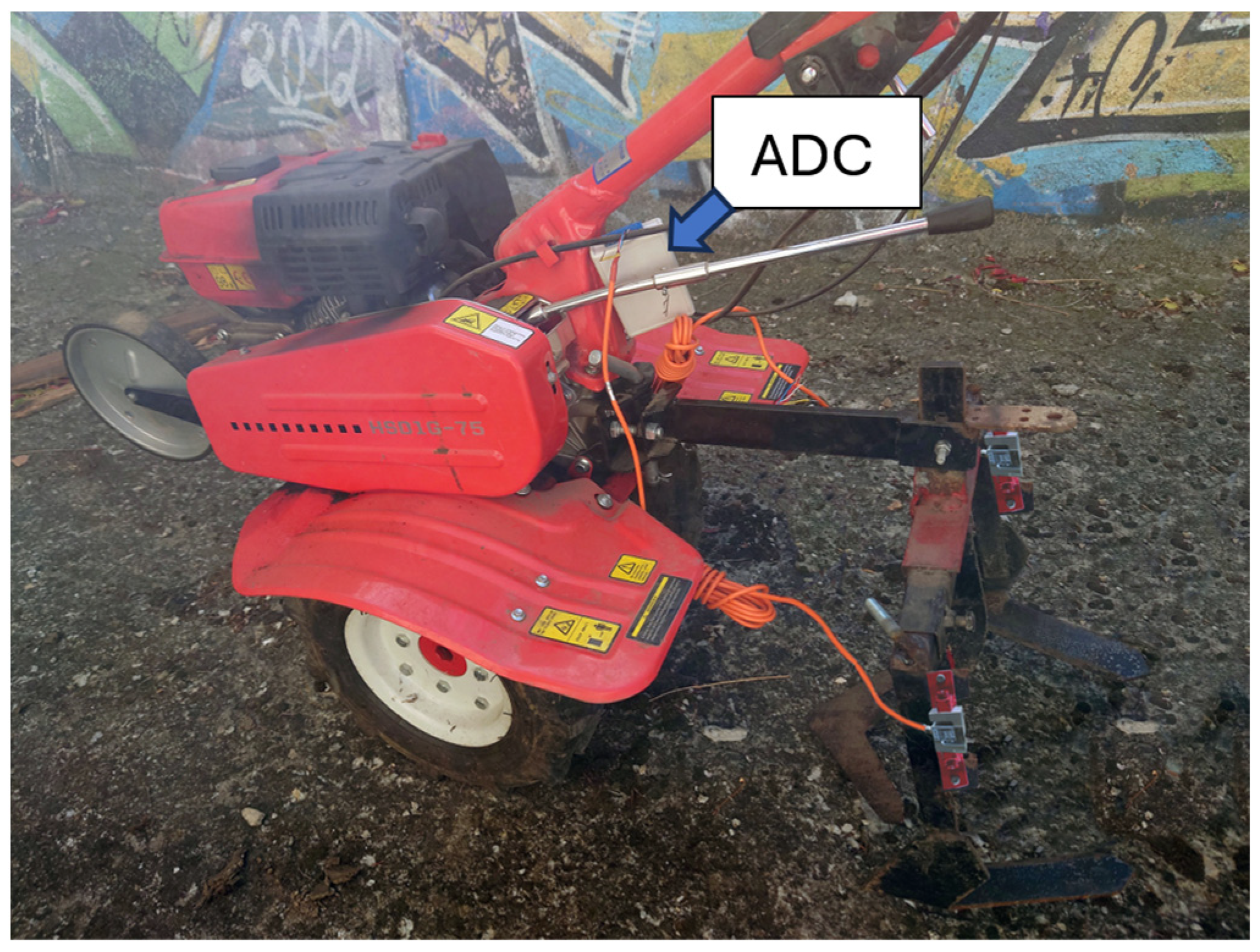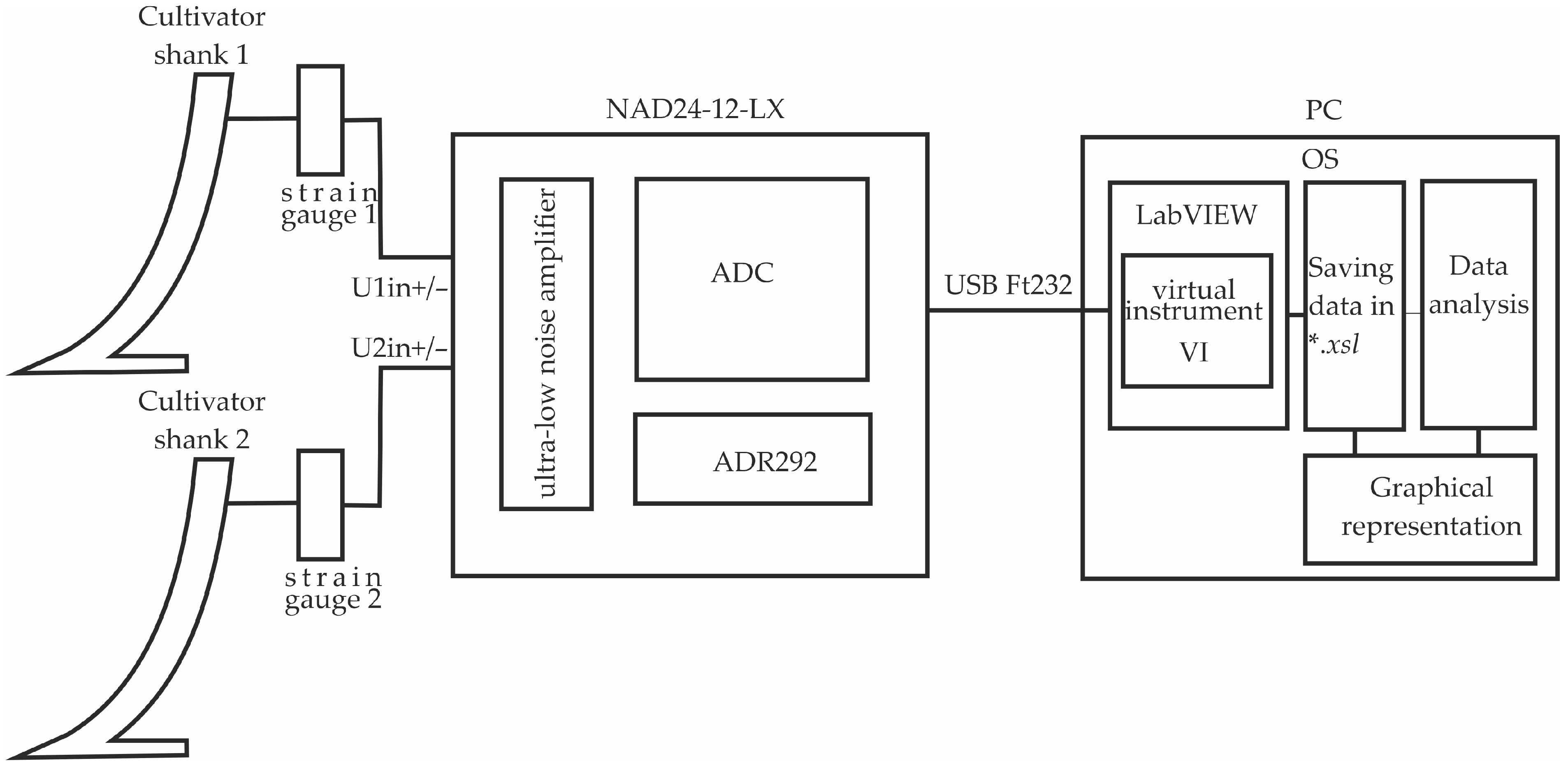 The analog-to-digital converter (ADC) sequentially acquires the input signals U1 and U2, each connected to a strain gauge measuring the mechanical deformation forces in the holder of the cultivator’s working body. The data acquisition rate is 57,600 bit·s−1, with a sampling interval of 1 s. The ADC measures the differential voltage between the positive and negative inputs of each channel.