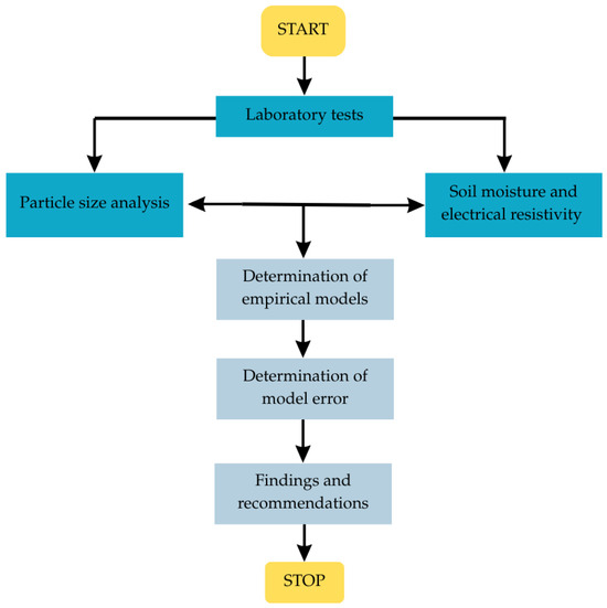 Based on previous studies, we hypothesize that nonparametric machine learning models such as Spline-Log, RBF, LOESS, LASSO, and RIDGE will exhibit superior predictive performance (higher R2 and lower RMSE and MAE values) compared to explicit empirical equations and segmented functional models when describing the moisture–resistivity relationship under controlled laboratory conditions. Furthermore, the predictive accuracy of all models is expected to vary depending on the soil type (sandy, silty, and clayey), reflecting the influence of soil texture and fines content on electrical resistivity behavior.