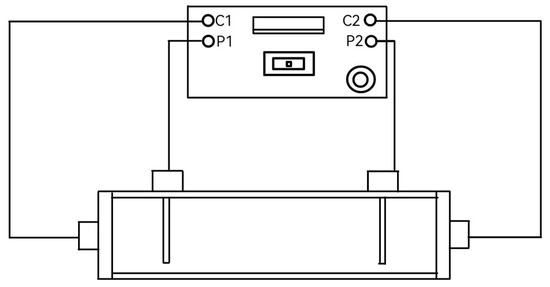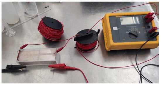 The electrical resistivity of each sample was measured using the Wenner method in a Soil Box-type container, with a high-precision digital tellurometer Fluke 1623 Earth (Fluke Corporation, Everett, WA, USA), in accordance with ASTM G57-20 [56] and ASTM G187-18 [57]. This method involves injecting an electric current through two outer electrodes (C1 and C2) and measuring the potential difference between two inner electrodes (P1 and P2), arranged at equal distances in a 4-pin Wenner configuration, as shown in Figure 2. The electrodes were placed at a depth not exceeding 5% of the minimum electrode spacing, ensuring that the geometric factor is properly accounted for in the resistivity calculation. Although the soil box contains integrated electrodes connected to the tellurometer, a conductive paste was applied to minimize contact resistance. This paste is a commercially available, non-toxic, water-based conductive gel with high ionic conductivity, designed to maintain stable electrical contact and reduce measurement variability.