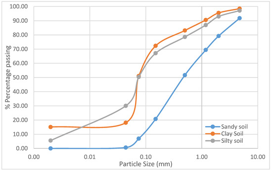 Figure 4 presents the granulometric curves for the three types of soil analyzed (sandy, silty and clayey), showing the accumulated percentage passing (% passing) as a function of particle size (mm).