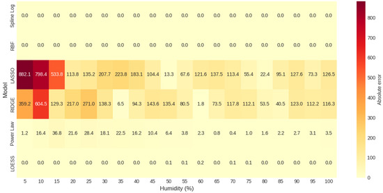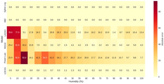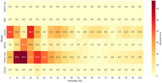 In contrast, the Power Law model and the Segmented Equation offered acceptable performance with explicit formulations. The Power Law model stood out for its mathematical simplicity ( = 0.99), albeit with a high MAPE, while the Segmented Equation achieved greater relative accuracy (MAPE = 15.10%) and consistency across both humidity extremes.