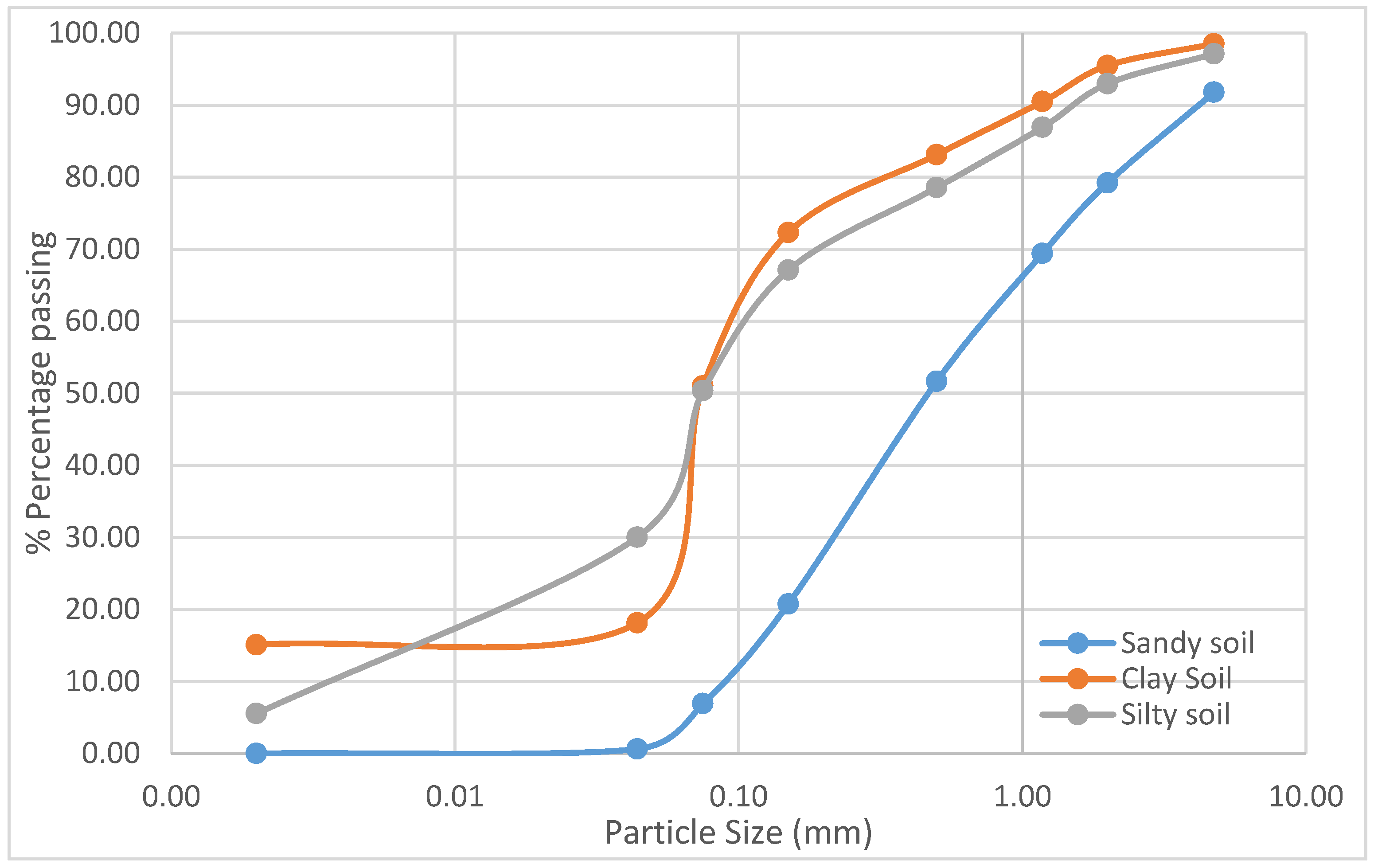 Soil samples were collected directly from field sites selected for their predominant textural characteristics (sandy, clayey, or silty). The sampling procedure was designed to ensure representativeness of natural soil conditions in each category. No preconditioning or artificial treatment was applied to the samples prior to laboratory testing in order to preserve their natural composition and structure as closely as possible.