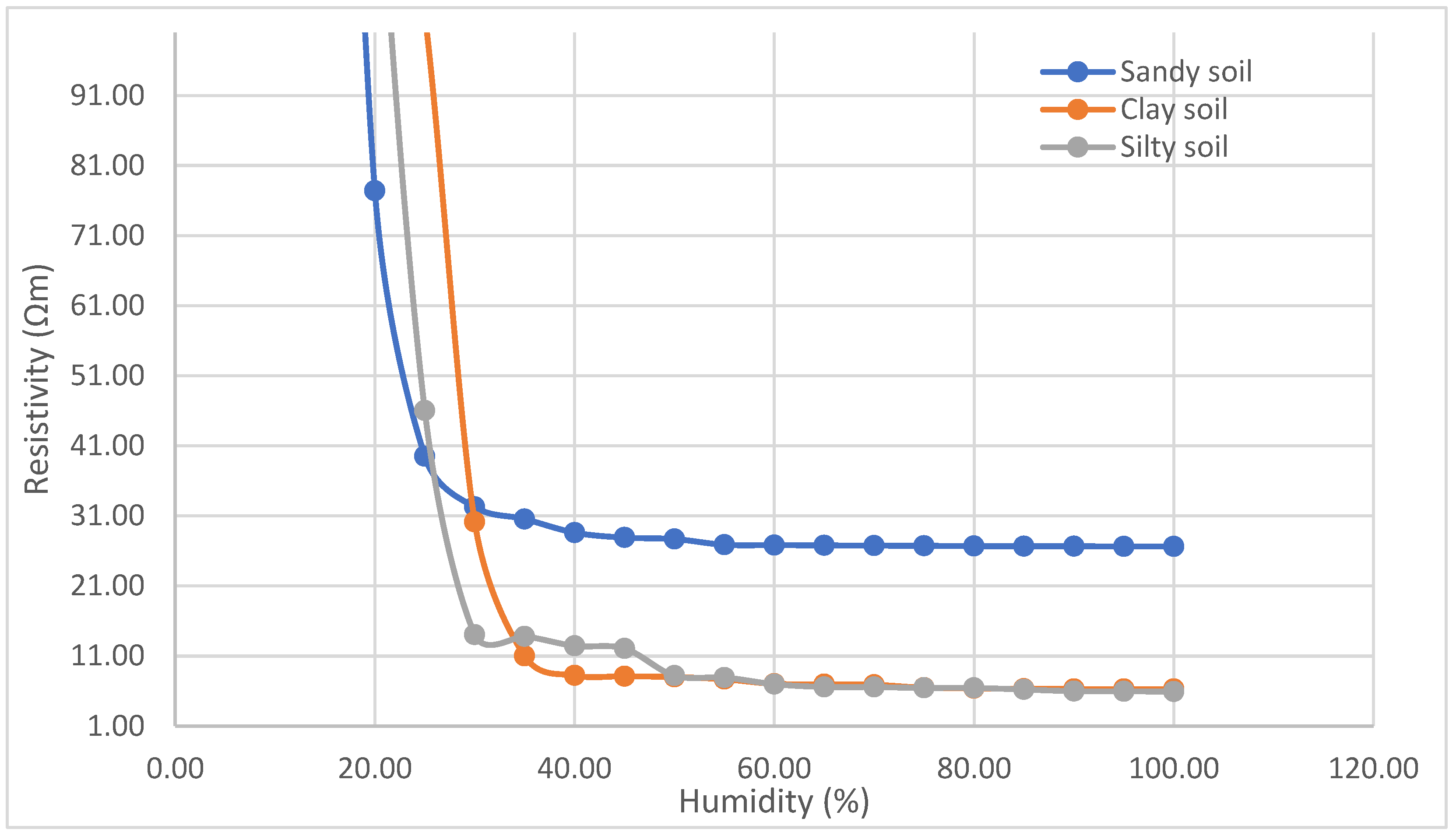 Among these, gravimetric moisture content plays a determining role by modifying the contact between soil particles, particularly between clay minerals and the surrounding silt and sand grains, and consequently the soil’s ability to conduct electric current [18,19,20]. Understanding the relationship between soil moisture and its electrical resistivity allows for the development of useful predictive models to optimize systems dependent on the electrical properties of the ground.