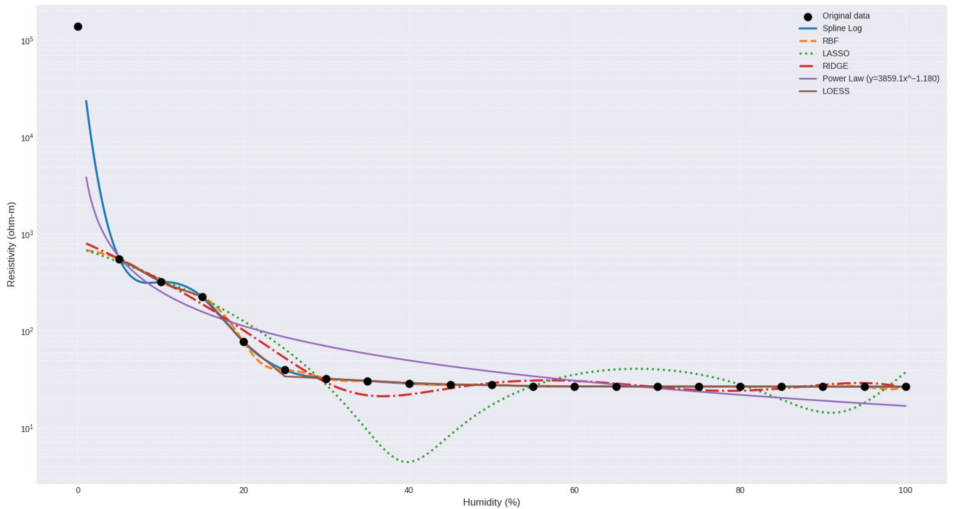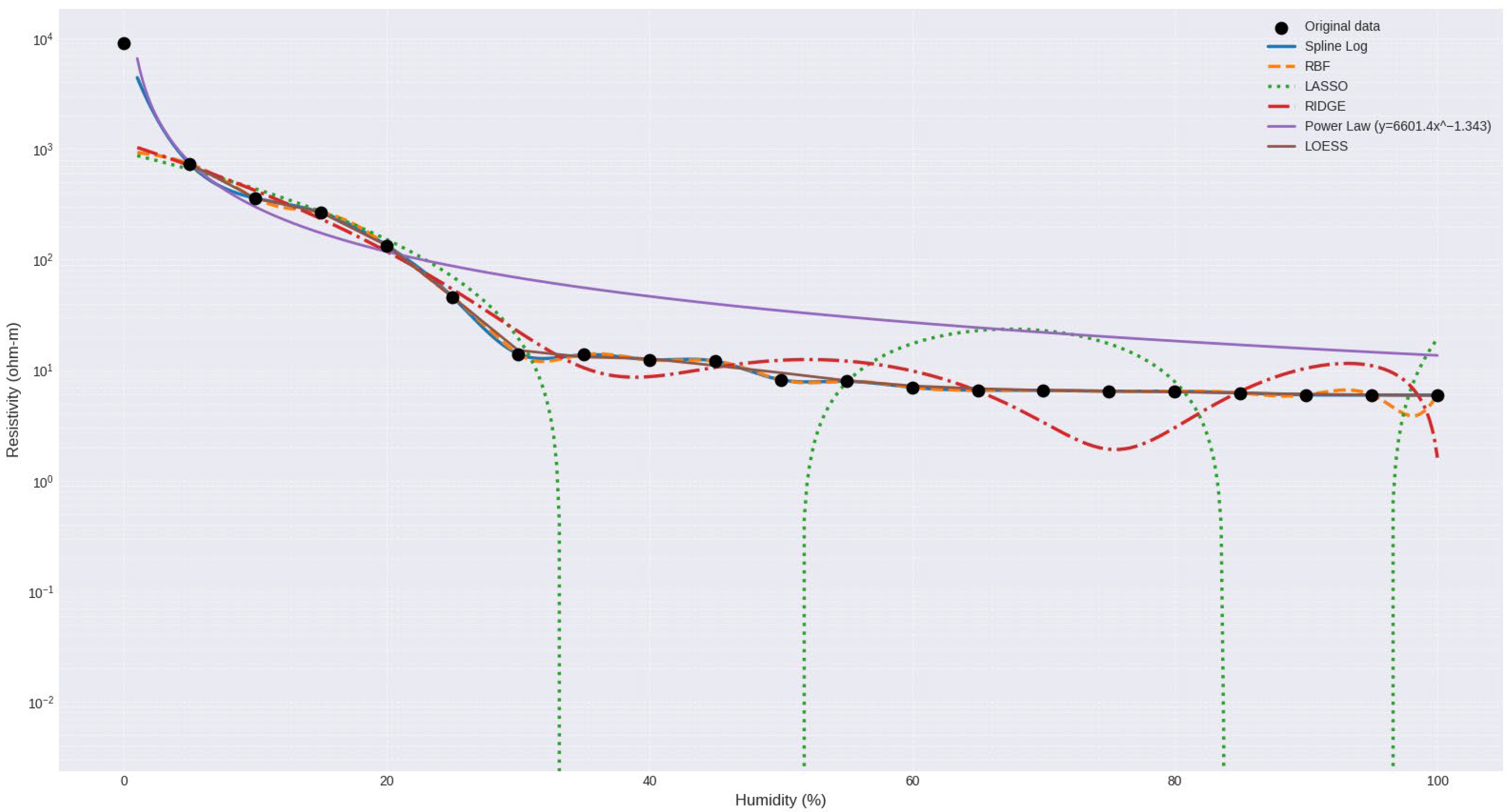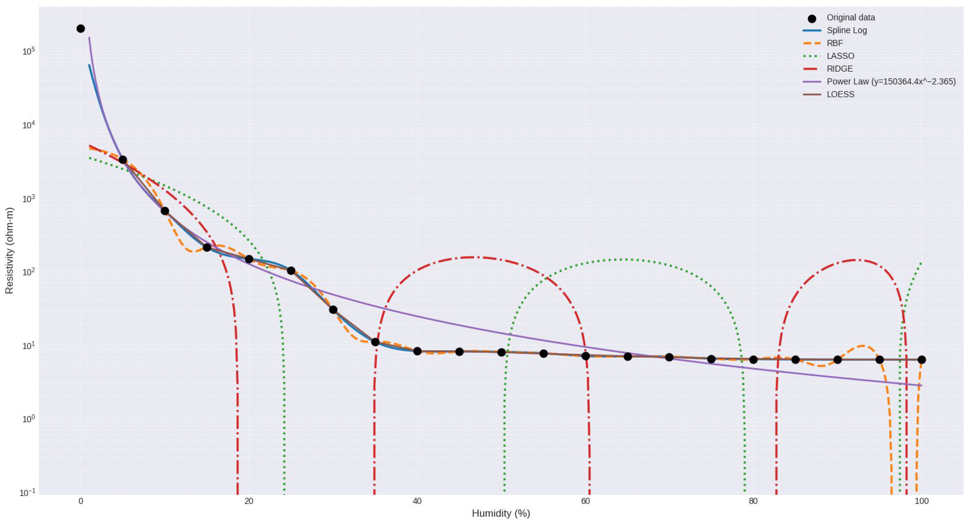 To ensure reproducibility, each model was implemented using specific functions. CubicSpline (SciPy) was used to interpolate nonlinear behavior by generating piecewise smooth polynomials. The RBF (Radial Basis Function) module was employed to capture localized nonlinearities in the data, particularly suited to irregular moisture–resistivity distributions. Parametric models, such as power law, logarithmic, and polynomial equations, were fitted using SciPy’s curve_fit function, which is based on a least-squares optimization routine [47,48].