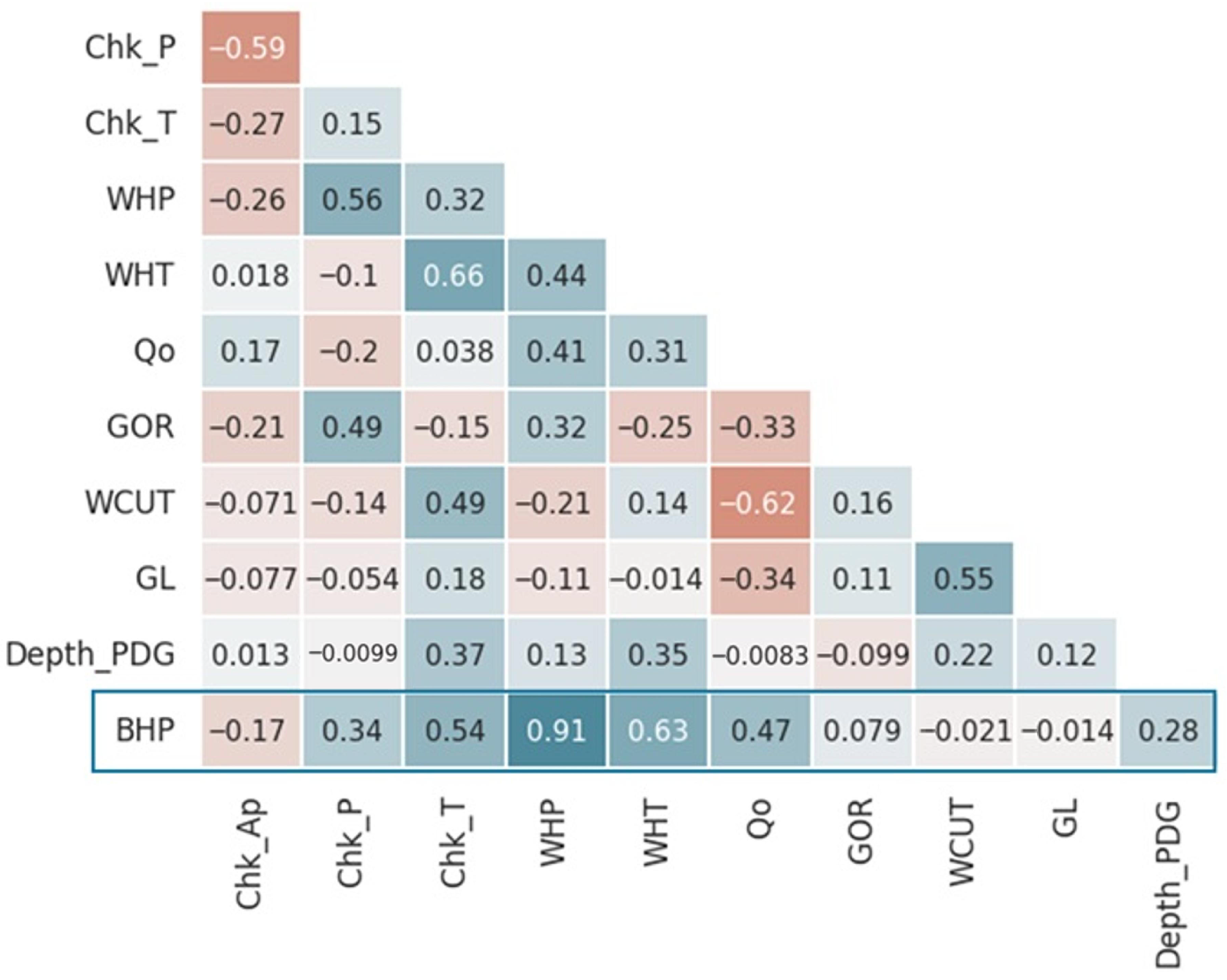 Figure 6), aiming to prioritize variables with more influence on BHP while minimizing redundancy among highly correlated input variable pairs. As a result, we removed water production and temperature sensor variables from some combinations. Additionally, we tested replacing gas rates and water rates with GOR and water cut to address lower variability and reduce the correlation with oil rates. For gas-lift rates, which only have nonzero values in a relatively small number of samples, we explored two strategies: treating it as a separate input variable or aggregating it with produced gas rates. In our case, the production tubing and pipelines have standardized diameters, and fluid properties are largely reflected in the existing variables, such as production rates. Therefore, we chose not to include additional variables related to these aspects. In other fields, however, this assumption may not hold, and including additional variables could be beneficial for improving model performance. The proposed combinations of input variables following this approach are presented in