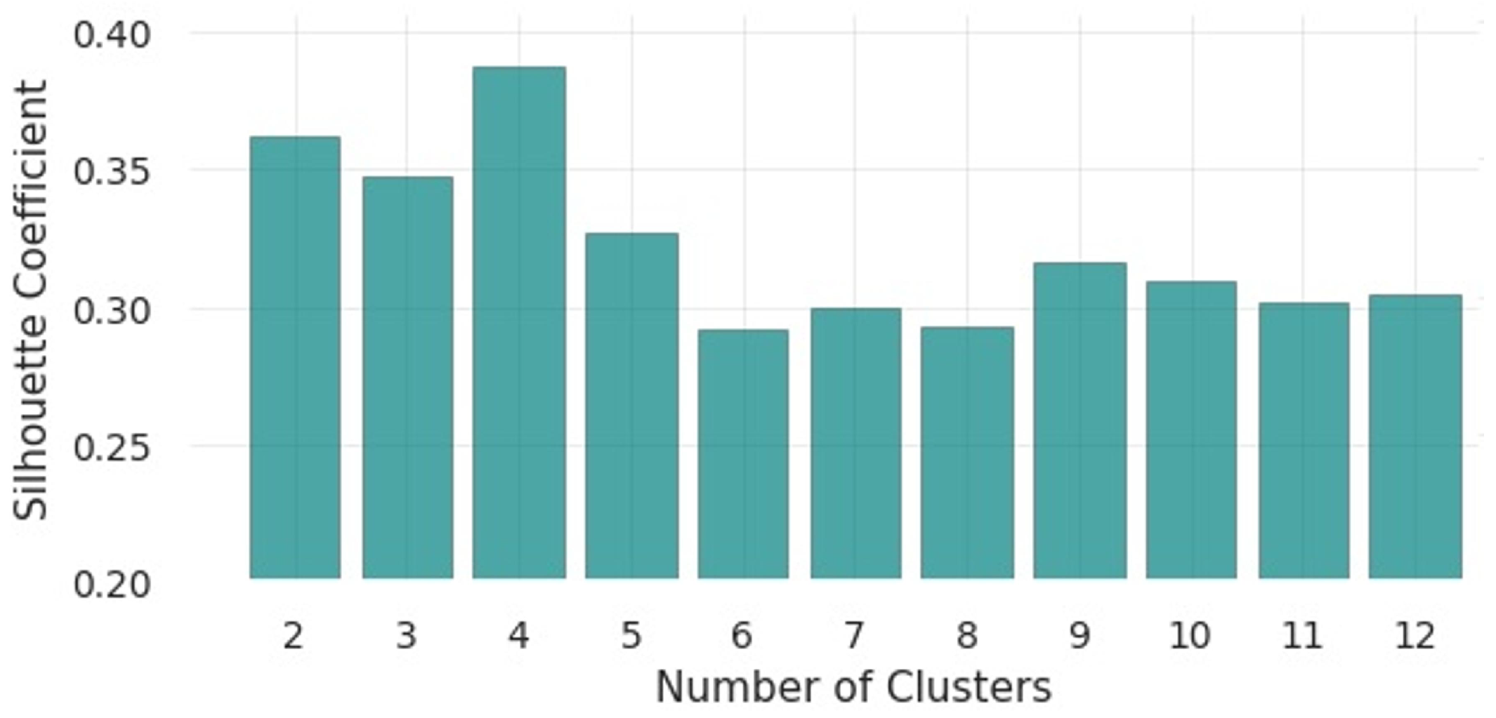The next step involved determining the number of clusters to be formed from our dataset in order to train our estimators within the ensemble configuration. As an initial basis for determining the optimal number of clusters, we used the Silhouette technique, as outlined in