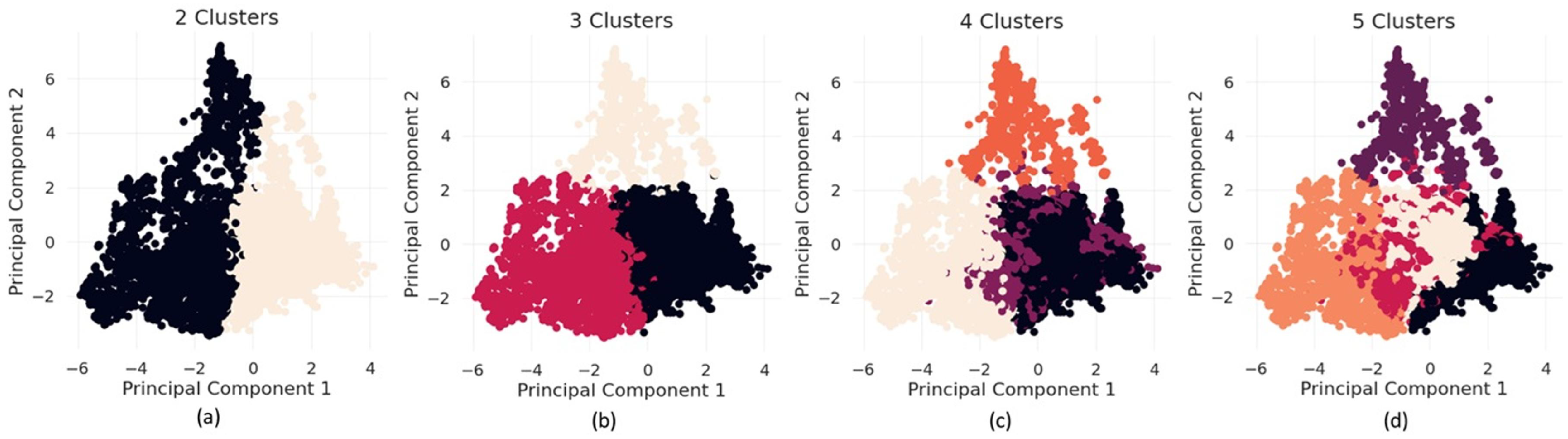 Figure 12 illustrates the different cluster subdivisions, using the two principal components with the highest cumulative variance as axes in the plots, derived from Principal Component Analysis (PCA) for dimensionality reduction. This technique was used here solely as an additional tool to visualize the clusters in a 2D representation, although those clusters were defined in a multidimensional space using all input variables of the model. Details on how PCA works can be found in [