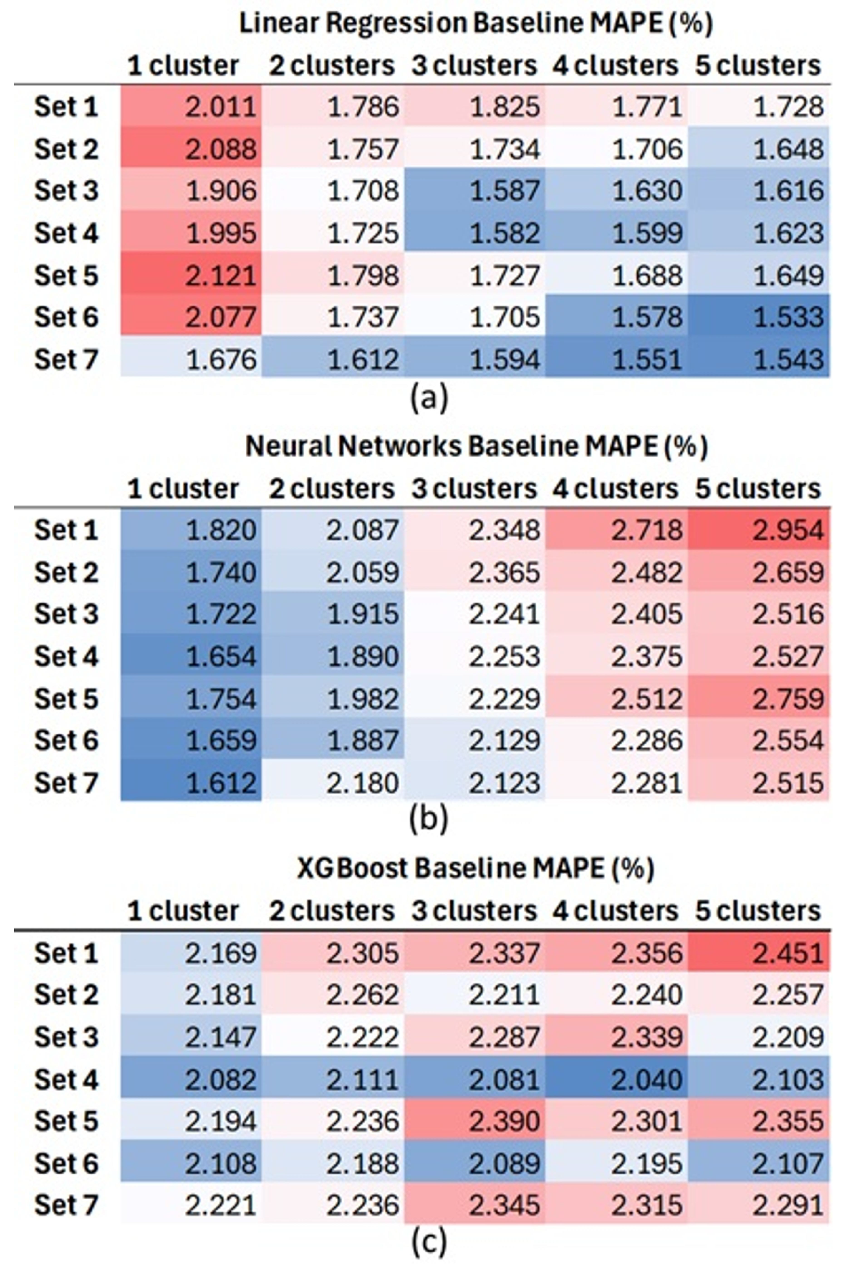 Figure 11. The highest Silhouette scores were observed for cluster numbers between 2 and 5, indicating effective group separation. It was also important to limit the number of clusters to ensure that each subset contained enough samples for meaningful model training, thus avoiding excessive result dispersion. The final decision, however, was based on experiments with cluster numbers within this range, evaluated alongside the selection of input variables, using baseline models from all three ML families addressed in our study. These results are presented later in this section.