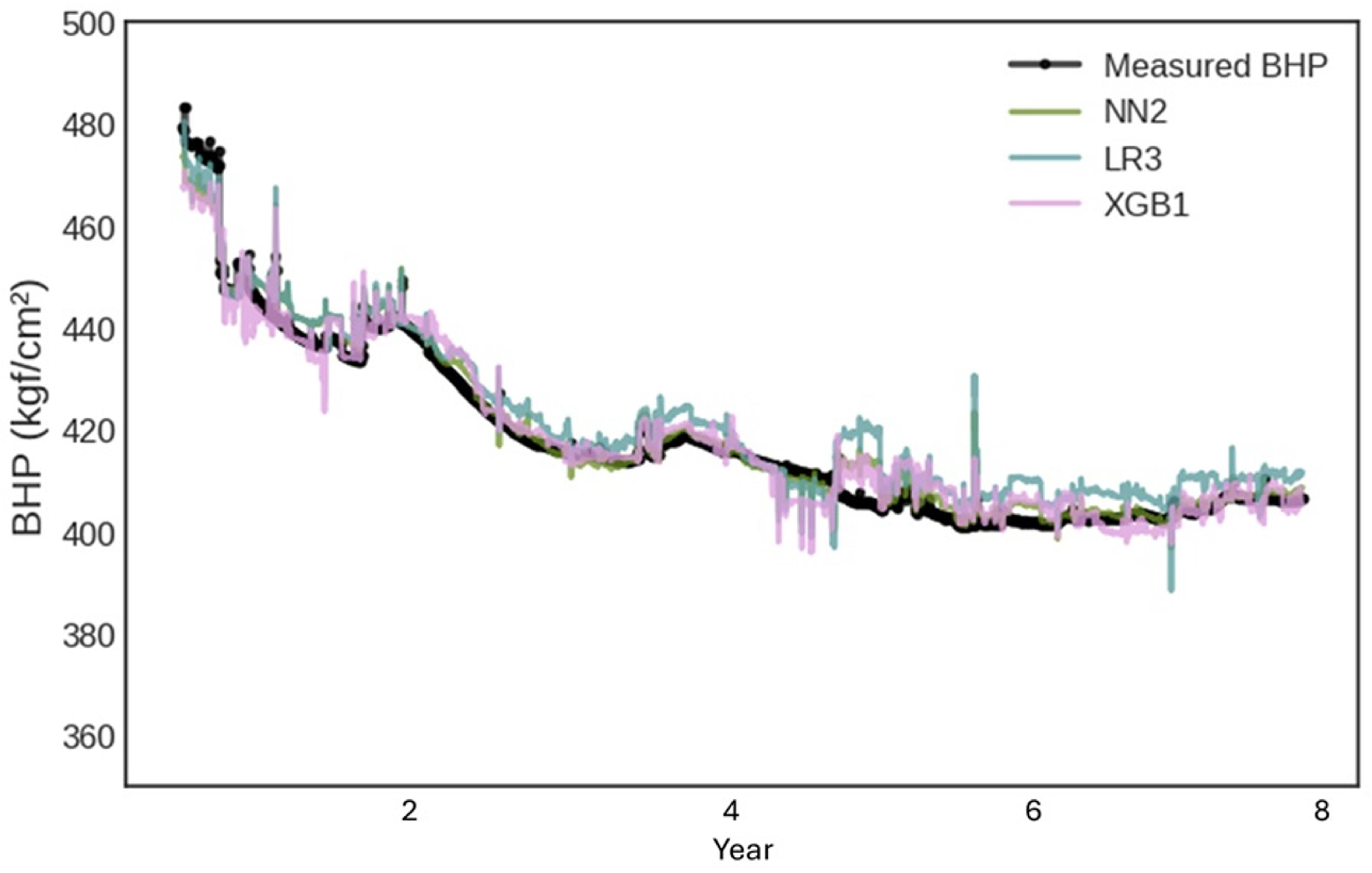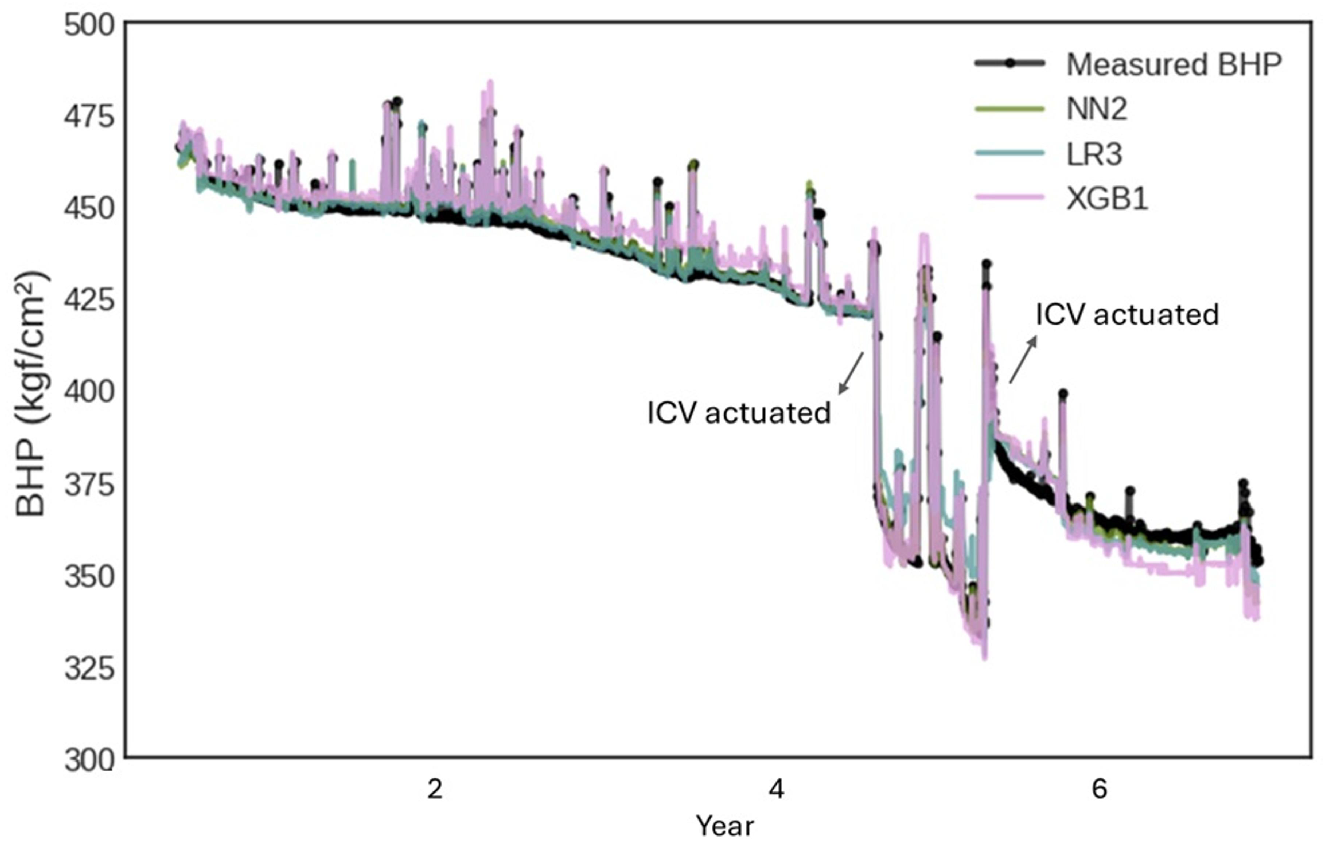 To illustrate the applicability of the framework to real wells under various production conditions, we analyzed specific cases and compared the results in the form of pressure history curves, where at each timestep the instantaneous BHP was estimated from the input variables measured at the same timestep. Since most wells experience significant changes in production parameters, we found it essential to demonstrate that the models can maintain performance following these changes, whether they occur gradually (as in depletion) or abruptly (as in productive interval changes). The first example, shown in