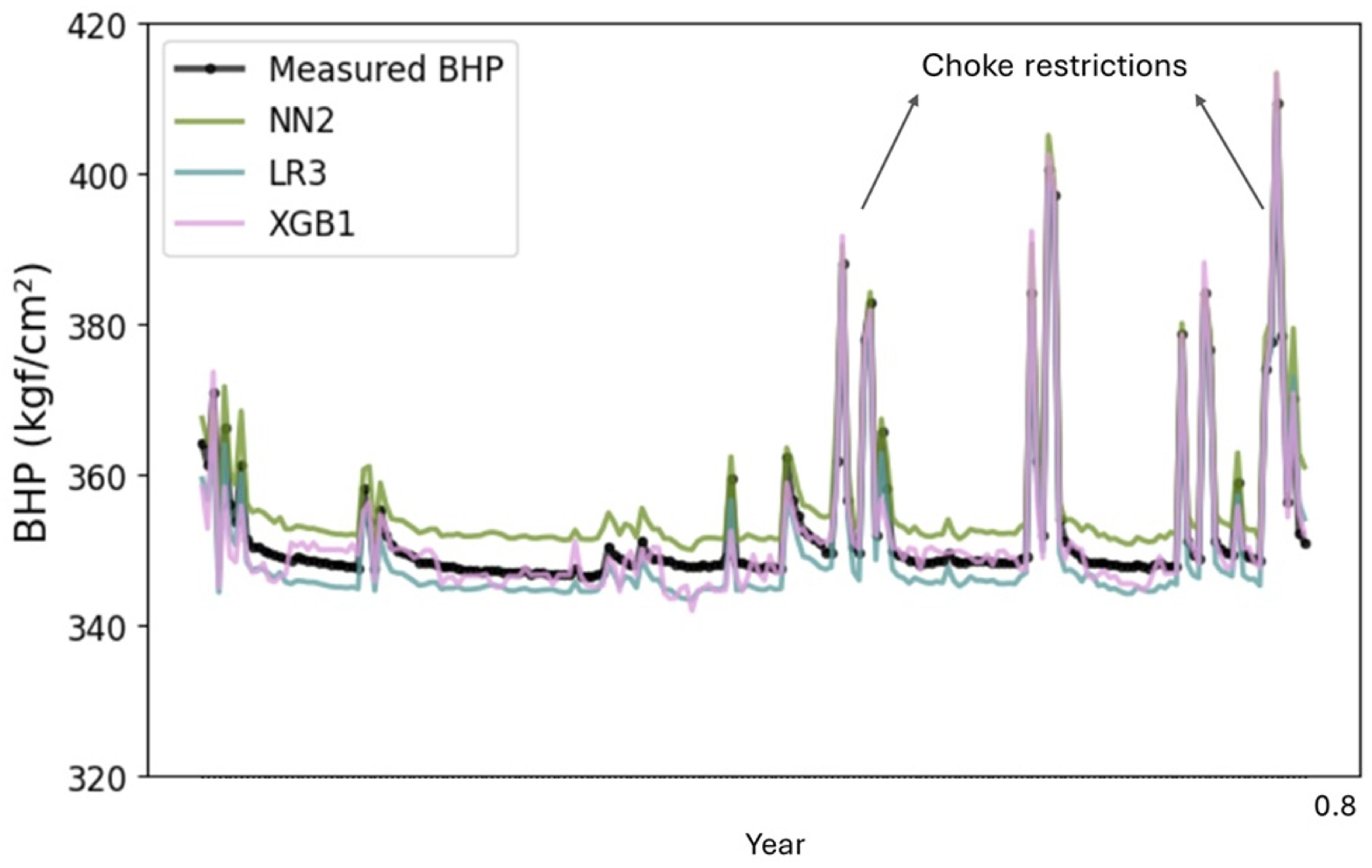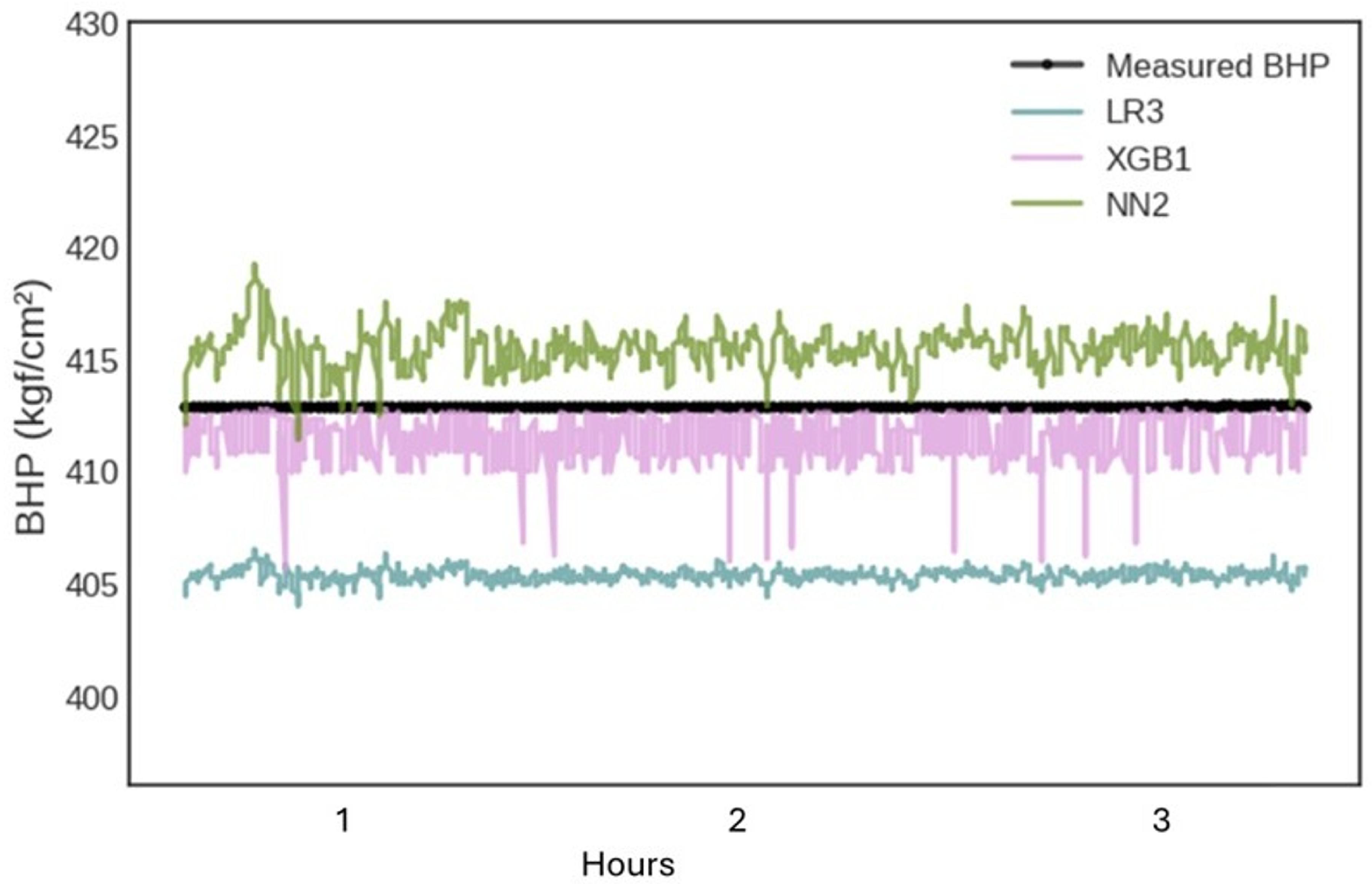 Figure 22 an example of use for a well under production test. In such cases, a single well flows towards a separator test, where we have produced rates measured with the same 1 Hz frequency of the pressure and temperature sensors. This example brings measured and estimated BHP values over a 3-h period. Although the measured flow rate signals are noisier than the measures of pressure and temperature, the models still exhibited excellent performance, with average MAPEs: LR3 = 1.83%, XGB1 = 0.44%, and NN2 = 0.36%.