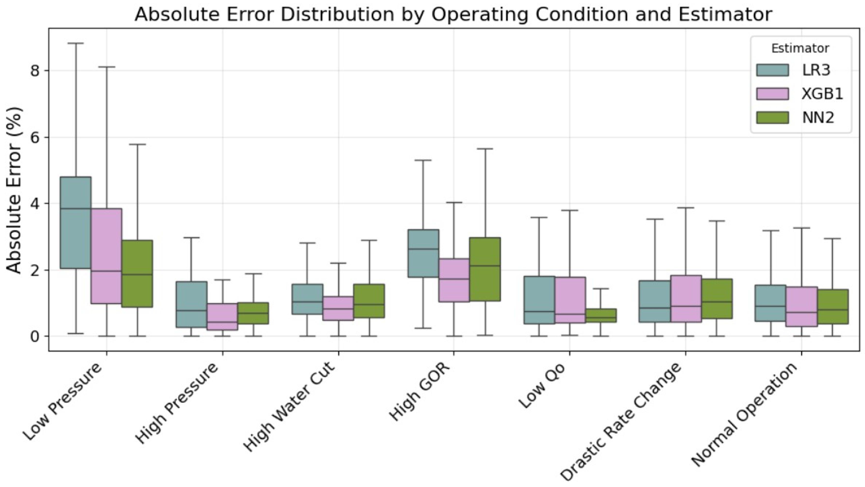 Figure 20. By analyzing the boxplots of error distributions for each edge condition and comparing them to the overall error distribution, we found that low-pressure conditions represent the most challenging scenario for all models, with error metrics 2.3–3.0 times higher than overall performance. This degradation was particularly notable for LR3 (MAPE 4.03%), and can be attributed to more scarce low-pressure samples in the training dataset, as reservoir depletion scenarios are inherently underrepresented in the production history. We further illustrate that in