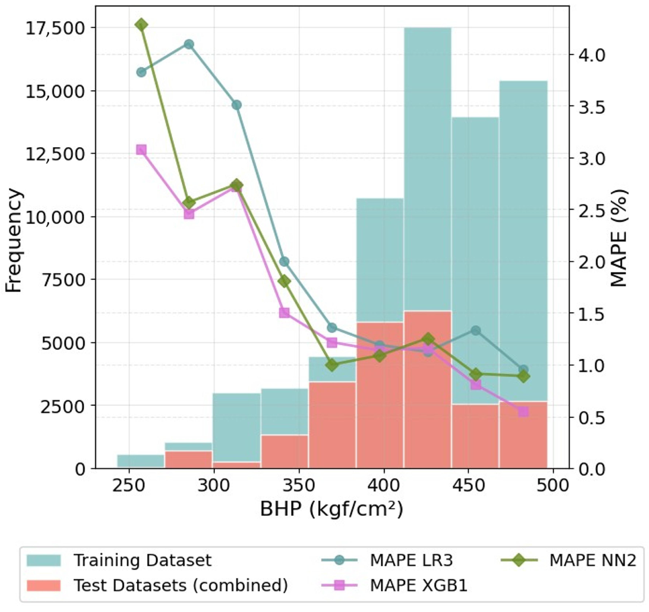 Figure 21, that contains the histograms of BHP for both training and test datasets, along with average MAPEs for each corresponding bin. Another reason for performance degradation in those conditions is that low pressures typically lead to more complex multiphase flow, with increased gas liberation causing more transitions in flow regimes (e.g., resulting in slug flow [
