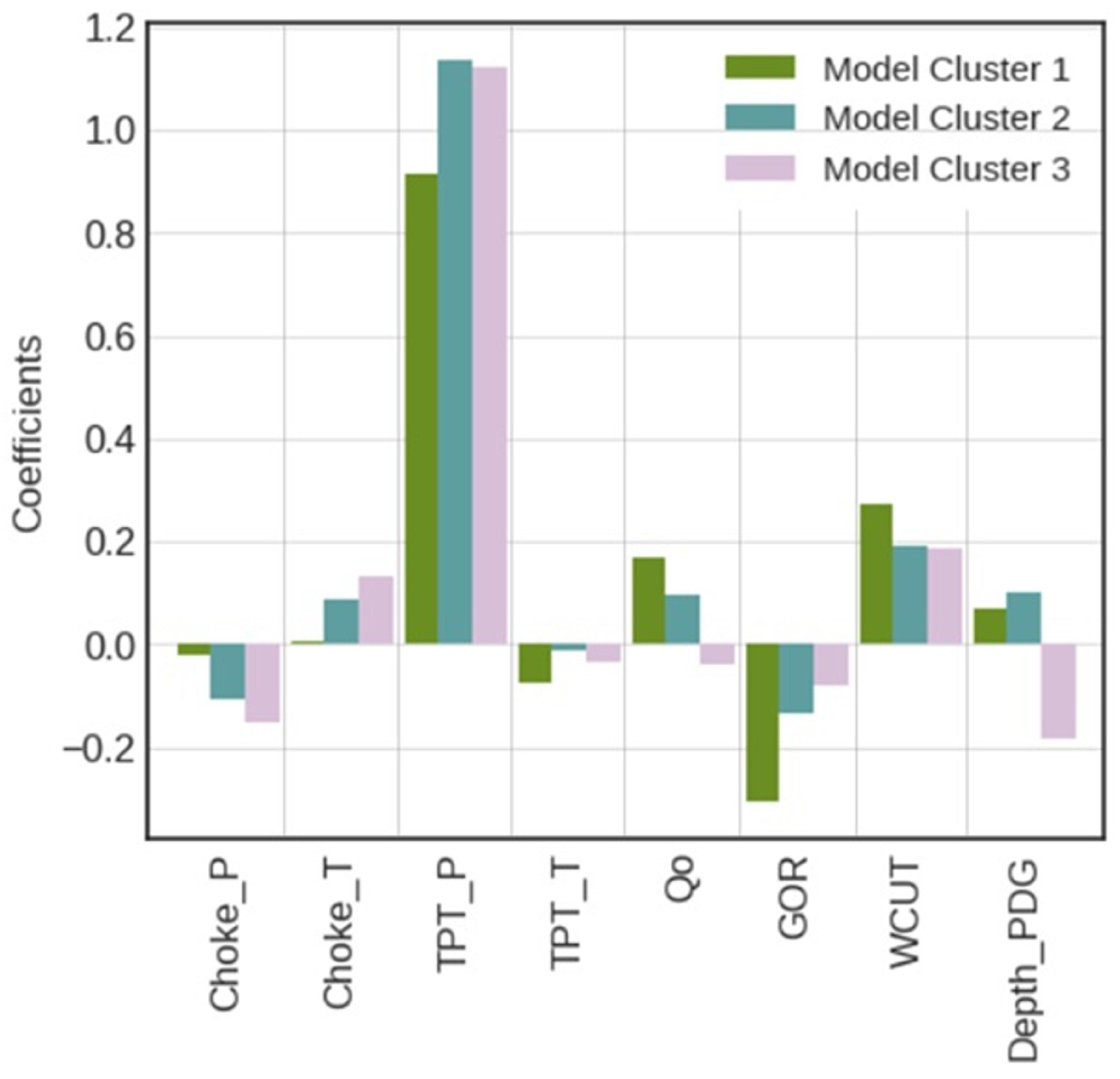 Figure 24. This approach allows us to identify the main characteristics that influenced the clustering performed by the unsupervised method (K-means) and to explore their relationship with the weight distributions in the adjusted linear regression model. This is insightful feedback, obtained after the design phase, and it can also be relevant for end users, such as reservoir and flow assurance engineers, to identify flow characteristics and have a critical view of the estimation results.