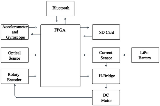 The railway vehicle consists of various control and data acquisition modules, including a Bluetooth module, an accelerometer, a gyroscope, an optical sensor, a rotary encoder, an SD card port, a current sensor, an H-bridge, a direct current (DC) motor, and the component that enables the entire system to operate: a SPARTAN FPGA. All of these components are powered by a LiPo battery, as shown in the schematic in Figure 2. The main parameters of the railway vehicle are presented in Table 1.