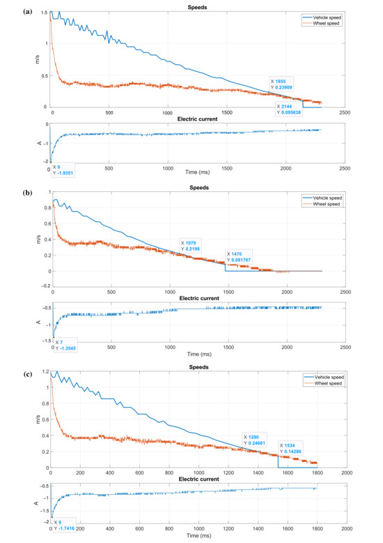 Finally, Figure 8c presents the results at a speed of 1.30 m/s. The braking time was 2568 ms and the creepage period was 2394 ms (93.224%) with a peak current of −1.742 A. The data in Table 2 indicate a braking distance of 1.590 m and a maximum creep of 75.825%.