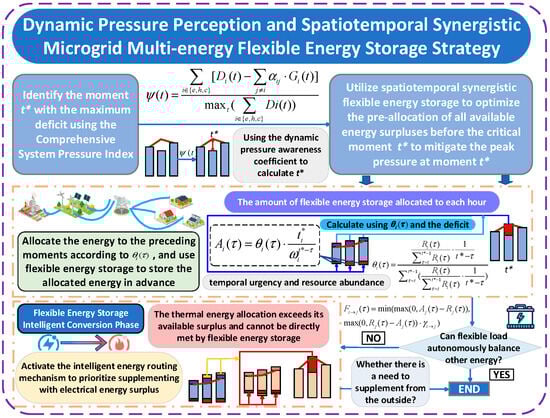 To address the challenge of achieving dynamic balance between supply and demand in microgrid systems, these systems feature coupled electrical, thermal, and cooling energy flows. This paper proposes a dynamic pressure-aware spatiotemporal collaborative optimization scheduling strategy. The strategy is driven by “flexible energy storage.” This strategy aims to transcend the limitations of traditional energy storage. Traditional storage primarily shifts energy across time and space. Our strategy establishes a closed-loop intelligent decision-making framework, which follows the sequence: “state perception → dynamic assessment → flexible energy storage → smart conversion → load optimization.”