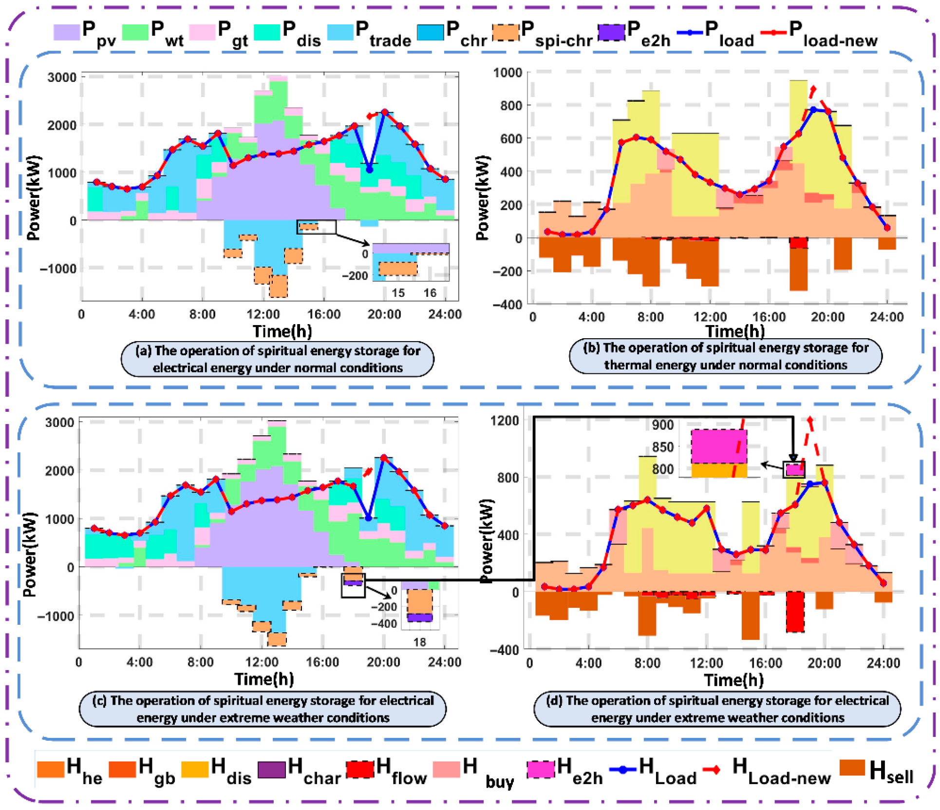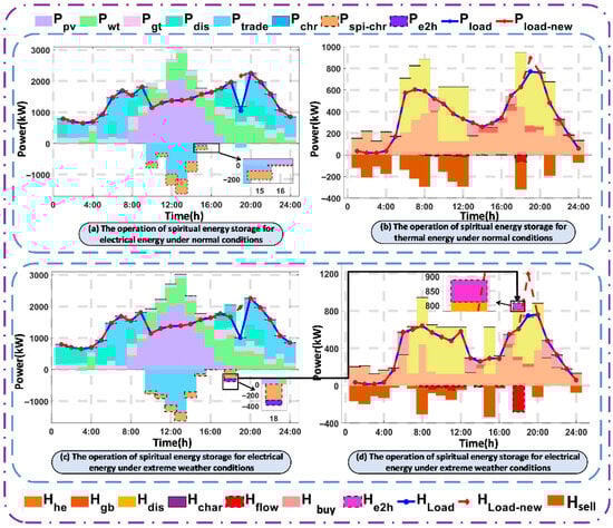 Figure 7a,b show the electricity and heat stack charts under normal conditions. First, it can be seen that the energy of the microgrid is always in balance. For Figure 7a, the key pressure moment calculated by the strategy is 19:00, with an electricity load deficit of 1120.00 kW. After the strategy is implemented, the electricity deficit at 19:00 is eliminated, and the load is scheduled and allocated in advance from 10:00 to 15:00 using a dynamic pressure perception and spatiotemporal collaborative optimization scheduling strategy. The highest electricity allocation is at 13:00, reaching 468.19 kW. In Figure 7b, the heat load deficit is 124.46 kW, which is also transferred using the strategy. The highest heat allocation is at 18:00, reaching 65.78 kW. Figure 7c,d show the balance of electricity and heat in the microgrid under extreme weather conditions. However, compared with Figure 7b, the heat deficit in Figure 7d reaches 444.46 kW at 19:00, and the internal heat energy cannot fill the deficit at this moment using flexible energy storage. At this time, intelligent conversion transforms 95.87 kW of electrical energy at 18:00 into heat energy, as indicated by the black arrow in the figure, which represents the transfer of energy.