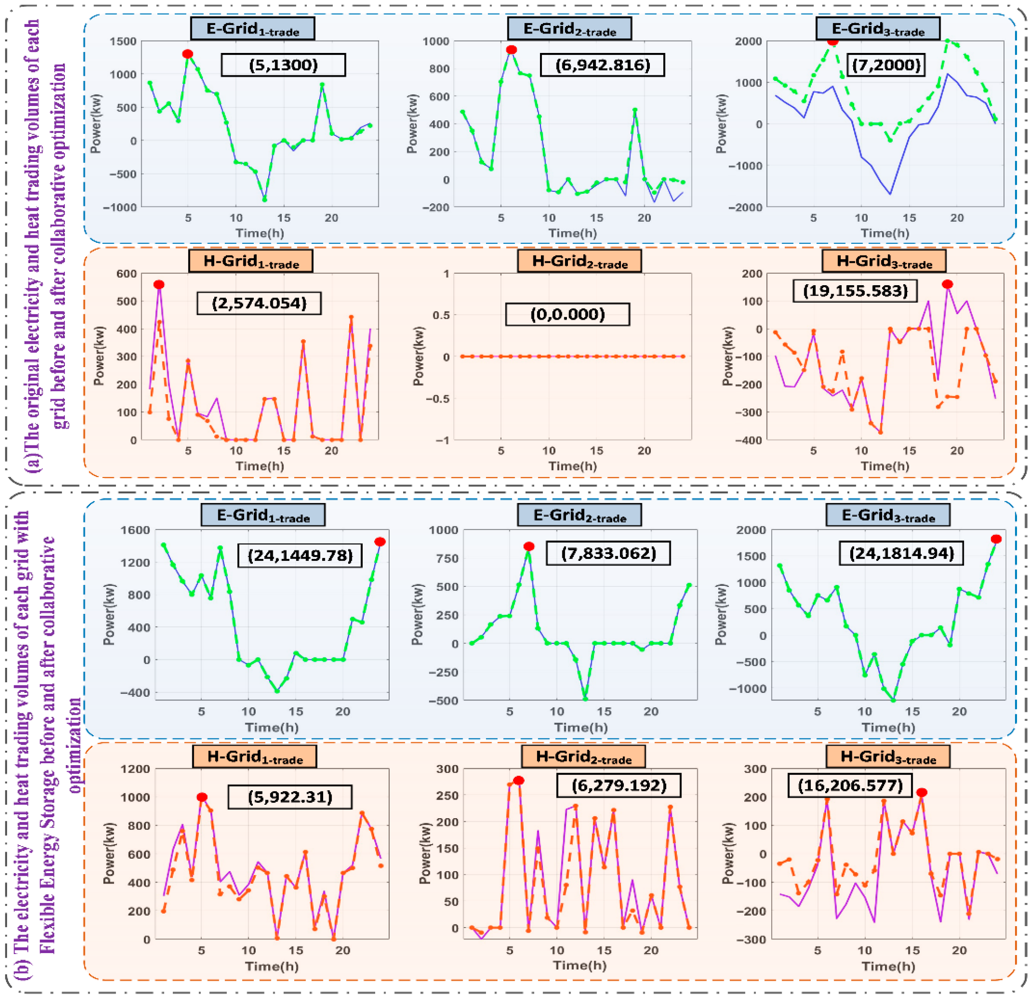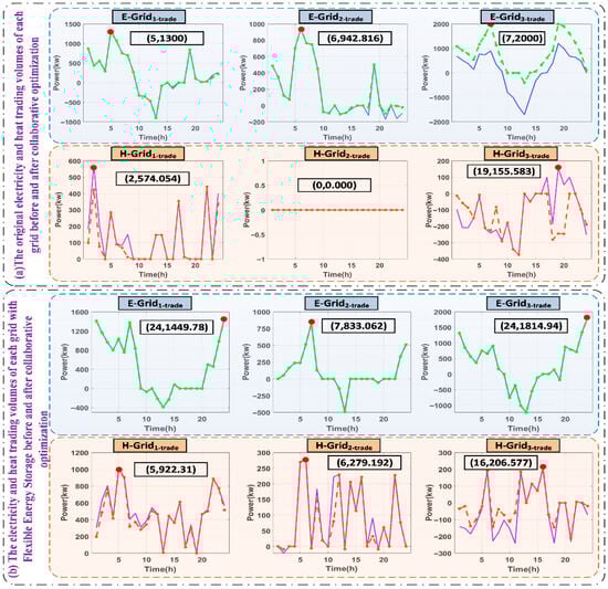 In Figure 8, the blue solid line represents the electricity purchased from or sold to the grid when each microgrid operates independently; the green dashed line indicates the net trading power between each microgrid and other microgrids or energy suppliers after internal coordination. Similarly, the purple solid line represents the heat energy purchased from or sold to the heat supplier when each microgrid operates independently; the red dashed line indicates the net trading power between each microgrid and other microgrids or energy suppliers after internal coordination. From Figure 8a, it can be seen that for electricity, before the introduction of flexible energy storage, the difference in trading power between the internally coordinated microgrid and Microgrid 3 operating independently is significant, with the maximum difference occurring at 13:00, approximately 1300 kW. For heat energy, before the introduction of the flexible energy storage framework, the maximum difference in heat trading occurs at 19:00, approximately 400 kW. Figure 8b shows that after the introduction of flexible energy storage and intelligent conversion, the net trading power of electricity between the internally coordinated microgrid system and the grid operating independently is completely identical, while the difference in heat trading is minimal, with the maximum difference occurring at 1:00, only about 176.3435 kW. This indicates that flexible energy storage significantly enhances the coordinated control efficiency of electricity and heat energy among grids. It is important to note that the case study presented here assumes the electrical and thermal networks within the microgrid cluster have sufficient capacity (i.e.,