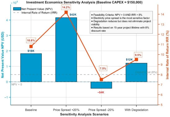 Comparative analysis of sensitivity (Note: The investment viability is highly sensitive to electricity price spreads, with a +20% change altering NPV from −USD 4200 to USD 41,500, while a 2% annual degradation rate reduces the IRR from 10.8% to 9.5%).