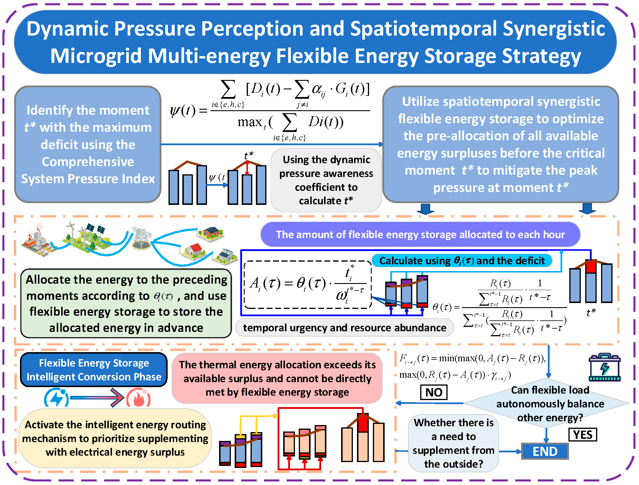 The core innovation lies in two interconnected concepts. First, “Dynamic Pressure Awareness” provides the system with a capability analogous to a “nervous system”. This capability enables the system not only to sense the current state of multi-energy flows but also to quantitatively assess and anticipate future moments of severe supply-demand conflict. This function shifts the system’s operational paradigm. It moves from passively responding to immediate imbalances to proactively identifying and preparing for critical stresses. Second, “Flexible Energy Storage” redefines the role of storage in integrated energy systems. It goes beyond merely shifting electricity in time. The strategy incorporates two key dimensions of flexibility: it decides “what form of energy to store or use” (electricity, heat, or cooling) and “how to optimally allocate it across space and time.” Together, these capabilities allow the system to strategically pre-store and pre-allocate decentralized energy surpluses along optimal spatiotemporal paths, thereby enhancing overall resilience, economy, and operational reliability.