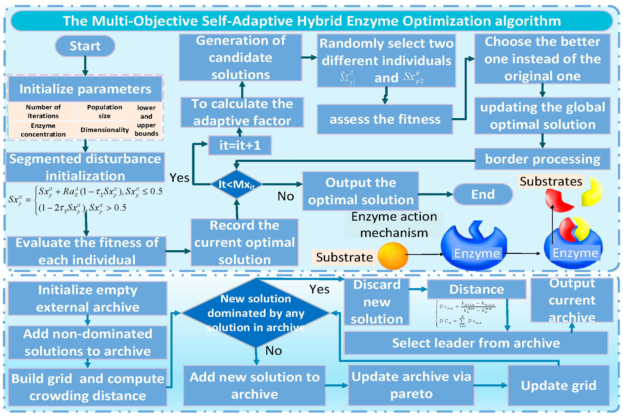 - The Multi-objective Self-adaptive Hybrid Enzyme Optimization Algorithm (MOSHEO) is proposed. To address the various limitations of the original Enzyme-inspired Optimization Algorithm (EAO), segmented perturbation initialization is introduced. By incorporating systematic bias and segmented perturbations, the initial population is ensured to more uniformly cover the entire search space. A nonlinear time-varying factor is adopted to delay the decay of the search rate, effectively extending the algorithm’s global exploration period. Meanwhile, a multi-source fusion approach is used to control the perturbation intensity, achieving a smooth self-adaptive transition from strong to weak perturbations. When generating candidate solutions, dynamic weighting and distance weighting based on search process information are introduced, effectively preventing the premature loss of population diversity.