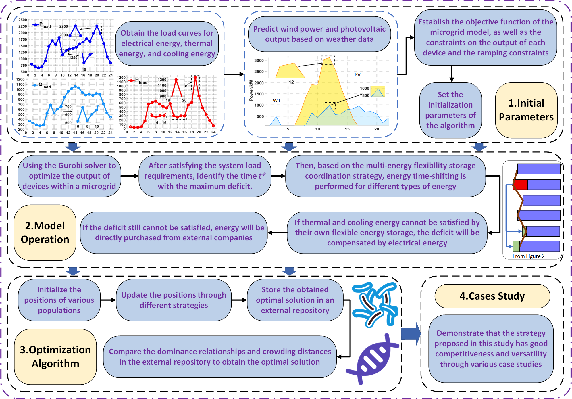 The structure of this paper is as follows: Section 1 is the introduction, systematically elaborating on the research background and significance of microgrids, comprehensively reviewing domestic and international research status, and summarizing the innovations and contributions of this paper. Section 2 constructs the microgrid system model and proposes the dynamic pressure-aware and spatiotemporal collaborative optimal scheduling strategy driven by Flexible Energy Storage. Section 3 proposes the Multi-objective Self-adaptive Hybrid Enzyme Optimization Algorithm. Section 4 verifies the effectiveness and universality of the proposed method and strategy through algorithm performance tests and multi-scenario case studies. Section 5 summarizes the full text.