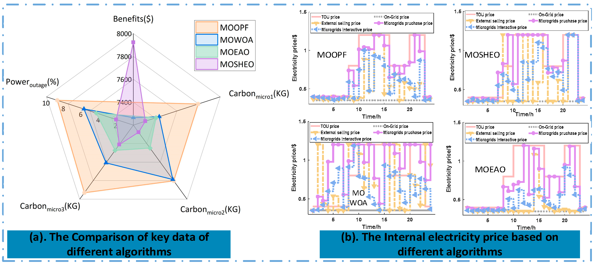 The Comparison of key data of different algorithms. (Note: The MOSHEO algorithm finds the optimal balance among the three conflicting objectives: economy, environmental friendliness, and reliability, while also achieving an economically viable price range.).