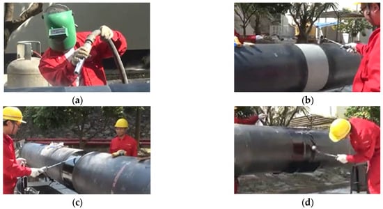 Manual joint-coating procedures: (a) sandblasting; (b) pipe preheating; (c) primer application; and (d) installation and heating of the heat shrink tape.