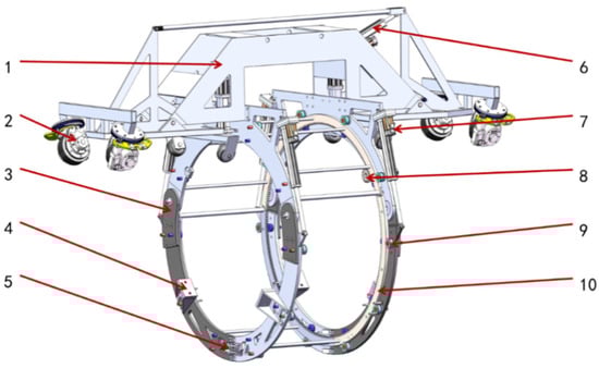 Schematic diagram of the universal mobile chassis structure. 1—Upper frame; 2—horizontal steering wheel; 3—support ring; 4—positioning block; 5—quick-lock mechanism; 6—obstacle-crossing linear actuator; 7—opening–closing linear actuator; 8—dive gear; 9—guide wheel; and 10—internal ring gear.