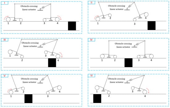 Obstacle-crossing workflow diagram. (I) Preparation for crossing the coating-repair area. (II) Crossing Pose 1. (III) Crossing Pose 2. (IV) Completion of the first-half crossing. (V) Crossing Pose 1. (VI) Crossing Pose 2.