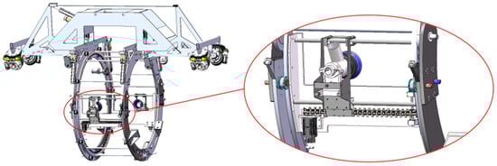Regarding the problem of inter-layer failure caused by mechanical rolling before the thermal shrinkable tape solidifies in the pipeline joint-coating operation, this paper proposes a four-wheel group alternating the crossing mechanism based on the wheel drive. The obstacle-crossing working principle is shown in Figure 3. The black part is the joint-coating area. To the right is the direction of the equipment’s movement. Under the actuation of the electric push rod, the drive wheel sets 1 and 4 are lifted alternately to accomplish the obstacle-crossing motion and the axial walking action.
