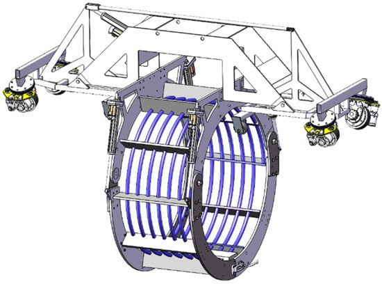 To address the common requirement of circumferential rotation in rust removal, primer spraying, and thermal joint sealing, a universal chassis was developed as a carrier for interchangeable modules. This modular design enables the flexible integration of sandblasting, heating, painting, and winding functions within a unified platform. The overall equipment design is suitable for 1219 mm pipelines, meeting the requirements of GB/T 51241-2017 “Pipeline External Anti-corrosion Joint Sealing Technical Specification” [].
