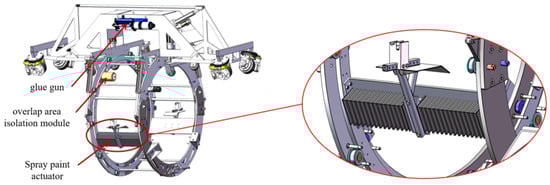 The automatic primer spraying module is shown in Figure 9. The equipment integrates the overlap isolation module, glue gun, and mobile spray head, etc. On the overlap area isolation module, there is a roll of isolation paper. As the rotating frame rotates, the isolation paper is wound around the overlap area of the pipeline anti-corrosion layer to prevent this area from being contaminated by the spray paint.