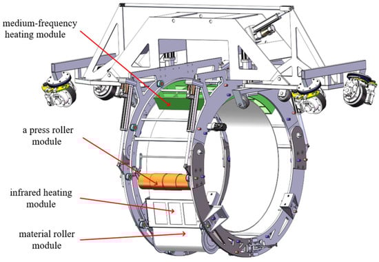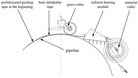 Research on mechanized joint-coating equipment remains limited both domestically and internationally. Hao Zhou et al. [] developed a mobile medium frequency heating device for heat-shrinkable-tape joint coating, enabling uniform heating, rapid temperature rise, and controlled temperature maintenance to resolve adhesive melting issues. Xinyu Lv et al. [] proposed a medium-frequency heating device for large-diameter pipelines. Changjiang Wang et al. [] designed a PLC-controlled automatic sandblasting system with a 600 mm rust removal width suitable for 1219 mm pipelines, featuring stable performance, high automation, and improved efficiency. Chao Jia et al. [] introduced an automatic rust-removal device for overhaul projects, achieving high efficiency and stable quality under terrain slopes below 15°. Changjiang Wang et al. [] further developed integrated devices, combining rust removal, medium-frequency heating, and infrared-assisted heating, forming a multifunctional system that covers surface treatment, primer heating, and heat-shrink-tape melting in a unified joint-coating process.