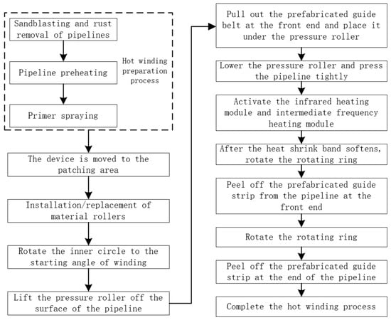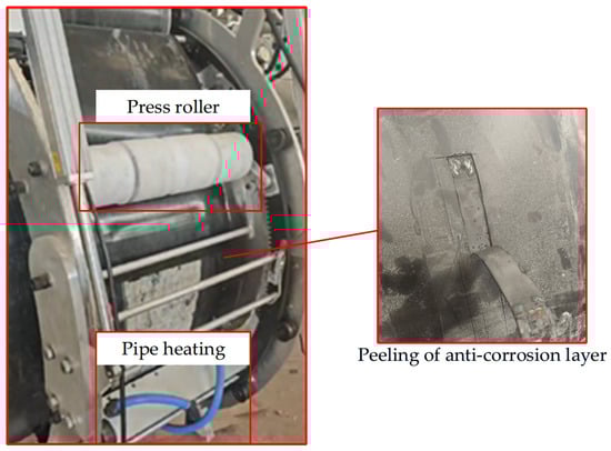 Ten anti-corrosion layers with a width of 300 mm were peeled off a pipeline as an experimental section, and tests were conducted on different functional modules on a universal chassis. Experimental research was conducted on the mid-frequency heating performance, primer spraying effect, and heat-shrink-tape winding effect, as shown in Figure 24. During the experiments, the equipment was operated under representative field conditions: it can travel on terrain with slopes up to 15°, suitable for straight long-distance pipelines. The system is powered by an AC 380 V source, stepped down to 220 V through the control cabinet to supply each module, with an air pressure of approximately 0.7 MPa and an ambient working temperature between –10 °C and 40 °C. These parameters, derived from multiple engineering applications, ensure stable operation and minimize any potential effect on the original pipeline structure and its anti-corrosion coating.