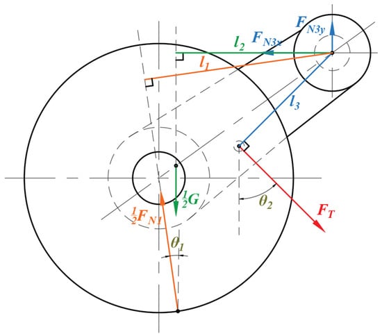 The force state of the drive wheel support frame is shown in Figure 4. Based on the force on the two-side support frames, the torque balance at points