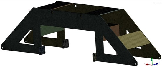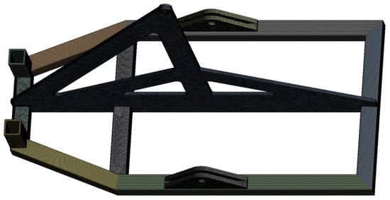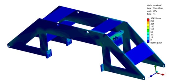 The obstacle-crossing frame is connected to the aforementioned support frame and the obstacle electric push rod. Its force state forms a balanced force of equal magnitude but opposite direction with each point of the support frame. The boundary conditions are set as shown in Figure 18. A tetrahedral mesh is used for the meshing of the obstacle frame, with a mesh size of 5 mm. The welding areas are processed with an increased level of encryption, which is set at two. The generated number of mesh nodes is 1,535,892, and the number of mesh elements is 722,721, as shown in Figure 19. The material of the obstacle frame is also 7075 aluminum alloy, and the relevant mechanical parameters are the same as before. The equivalent stress cloud diagram of the obstacle frame simulation result is shown in Figure 20. The stress concentration in the sharp corners is not of reference value and can be ignored. The equivalent stress of the frame is basically below 250 MPa, and the structural design meets the design standards and usage requirements and a has sufficient safety margin.