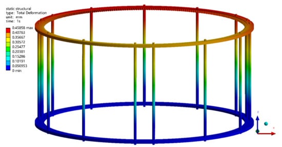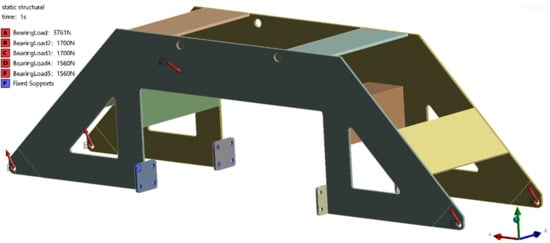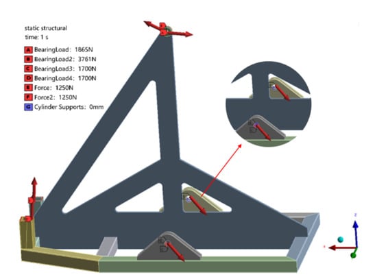 The tetrahedral grid was used for the meshing of the rotating frame, with a grid size of 5 mm. The grid size at the smaller structural surfaces was set to 3 mm. The welding areas were treated with an increased mesh density level of two. The generated number of grid nodes was 1,045,535, and the number of elements was 391,309. The generated grid is shown in Figure 15. The connection between the support frame and the equipment frame is set as a cylindrical support, with the added load based on the results of the force analysis. The boundary conditions are set as shown in Figure 16. The structural material is set as 7075 aluminum alloy, with relevant mechanical parameters being the following: density of 2.77 g/cm3, Young’s modulus of 71 GPa, Poisson’s ratio of 0.33, and yield strength of 455 MPa [].