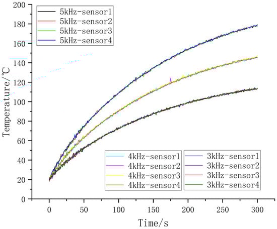 Heating the pipeline at heating frequencies of 5 kHz, 4 kHz, and 3 kHz, respectively, four temperature sensors were arranged at 90 ° intervals around the circumference of the pipeline to collect temperature changes on the surface of the pipeline. The results are shown in Figure 25.